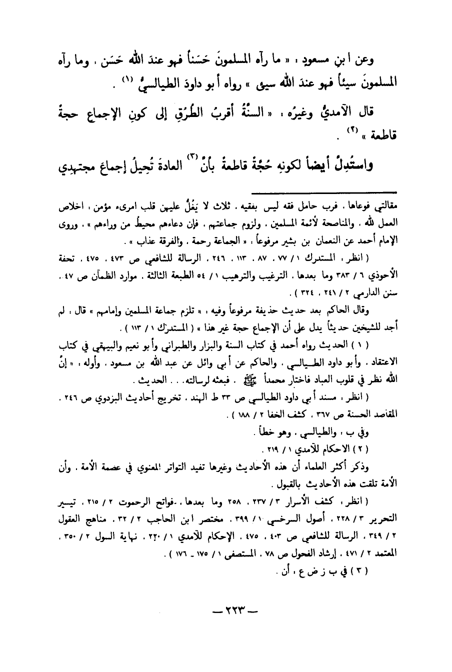 واستُدِلَّ أيضًا لكونه حجةً قاطعةً بأن3 العادةَ تُحِيل إجماعَ مجتهدي