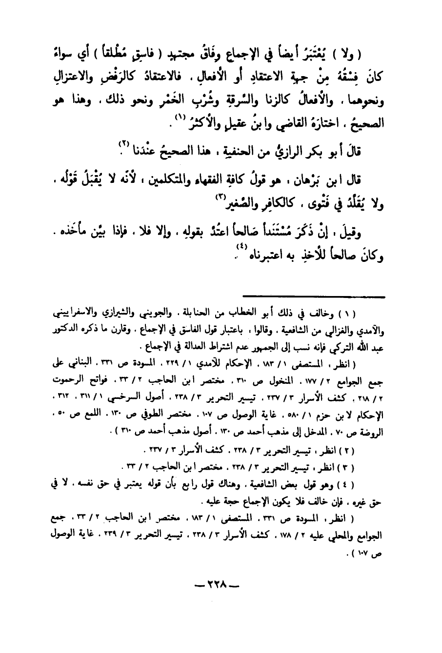 1 وخالف في ذلك أبو الخطاب من الحنابلة، والجويني والشيرازي والإسفراييني والآمدي والغزالي من الشافعية، وقالوا باعتبار قول الفاسق في الإجماع. وقارن ما ذكره الدكتور عبد الله التركي، فإنه نسب إلى الجمهور عدم اشتراط العدالة في الإجماع.