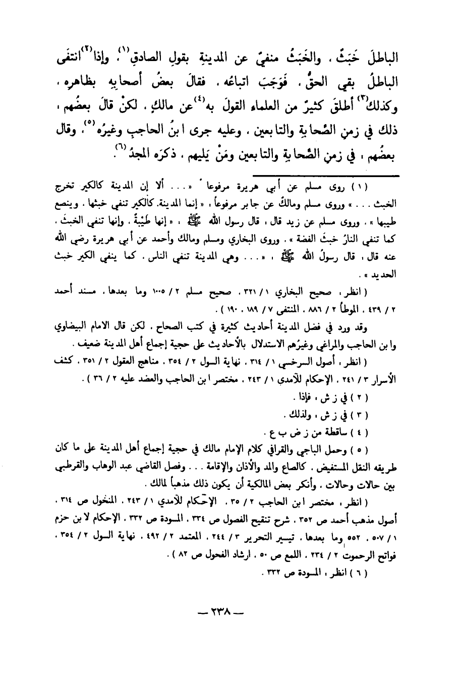 الْبَاطِلَ خَبَثٌ، وَالْخَبَثُ مَنْفِيٌّ عَنْ الْمَدِينَةِ بِقَوْلِ الصَّادِقِ1. وَإِذَا2 انْتَفَى الْبَاطِلُ بَقِيَ الْحَقُّ. فَوَجَبَ اتِّبَاعُهُ. فَقَالَ بَعْضُ أَصْحَابِهِ بِظَاهِرِهِ. وَكَذَلِكَ3 أَطْلَقَ كَثِيرٌ مِنْ الْعُلَمَاءِ الْقَوْلَ بِهِ4 عَنْ مَالِكٍ، لَكِنْ قَالَ بَعْضُهُمْ: ذَلِكَ فِي زَمَنِ الصَّحَابَةِ وَالتَّابِعِينَ. وَعَلَيْهِ جَرَى ابْنُ الْحَاجِبِ وَغَيْرُهُ5. وَقَالَ بَعْضُهُمْ: فِي زَمَنِ الصَّحَابَةِ وَالتَّابِعِينَ وَمَنْ يَلِيهِمْ. ذَكَرَهُ الْمَجْدُ6.
