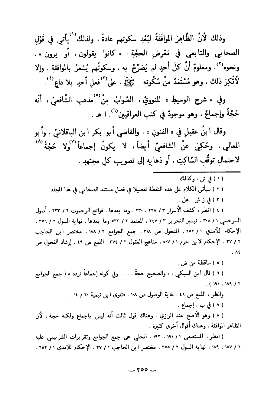 وَذَلِكَ: لأَنَّ الظَّاهِرَ الْمُوَافَقَةُ لِبُعْدِ سُكُوتِهِمْ عَادَةً. وَلِذَلِكَ1 يَأْتِي فِي قَوْلِ الصَّحَابِيِّ وَالتَّابِعِيِّ فِي مَعْرِضِ الْحُجَّةِ: "كَانُوا يَقُولُونَ أَوْ يَرَوْنَ" وَنَحْوُهُ2، وَمَعْلُومٌ أَنَّ كُلَّ أَحَدٍ لَمْ يُصَرِّحْ بِهِ، وَسُكُوتُهُمْ يُشْعِرُ بِالْمُوَافَقَةِ، وَإِلاَّ لأَنْكَرَ ذَلِكَ، وَهُوَ مُسْتَمَدٌّ مِنْ سُكُوتِهِ صَلَّى اللَّهُ عَلَيْهِ وَسَلَّمَ. عَلَى3 فِعْلِ أَحَدٍ بِلا دَاعٍ4؟.