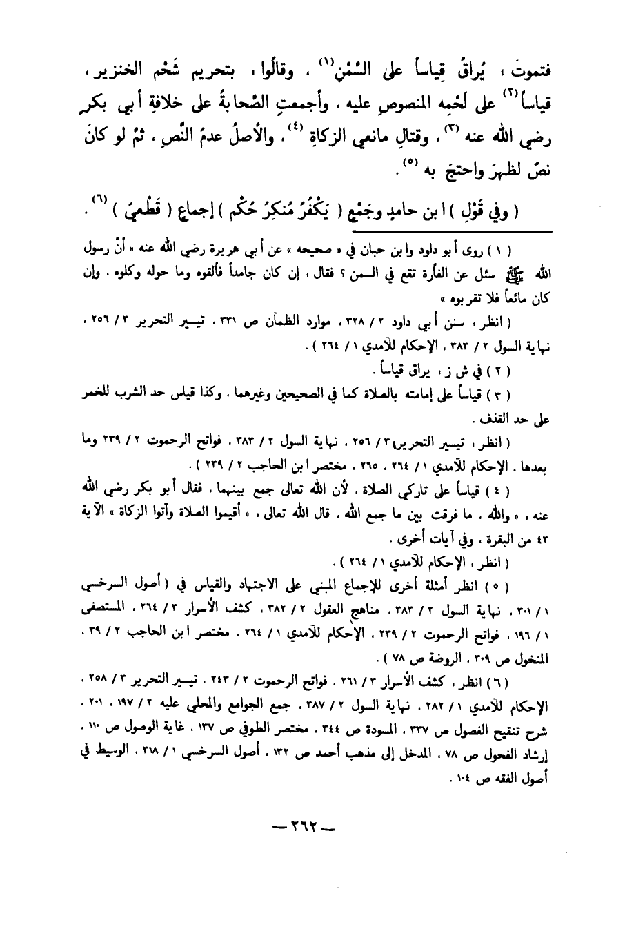 5 انظر أمثلة أخرى للإجماع المبني على الاجتهاد والقياس في أصول السرخسي 1/ 301، نهاية السول 2/ 383، مناهج العقول 2/ 382، كشف الأسرار 3/ 264، المستصفى 1/ 196، فواتح الرحموت 2/ 239، الإحكام للآمدي 1/ 264، مختصر ابن الحاجب 2/ 39، المنخول ص 309، الروضة ص 78.