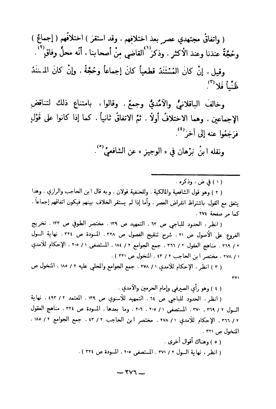 2 وهو قول الشافعية والمالكية. وللحنفية قولان، وبه قال ابن الحاجب والرازي، وهذا يتفق مع القول باشتراط انقراض العصر. وأما إذا لم يستقر الخلاف بينهم فيكون اتفاقهم إجماعاً كما مر صفحة 274.