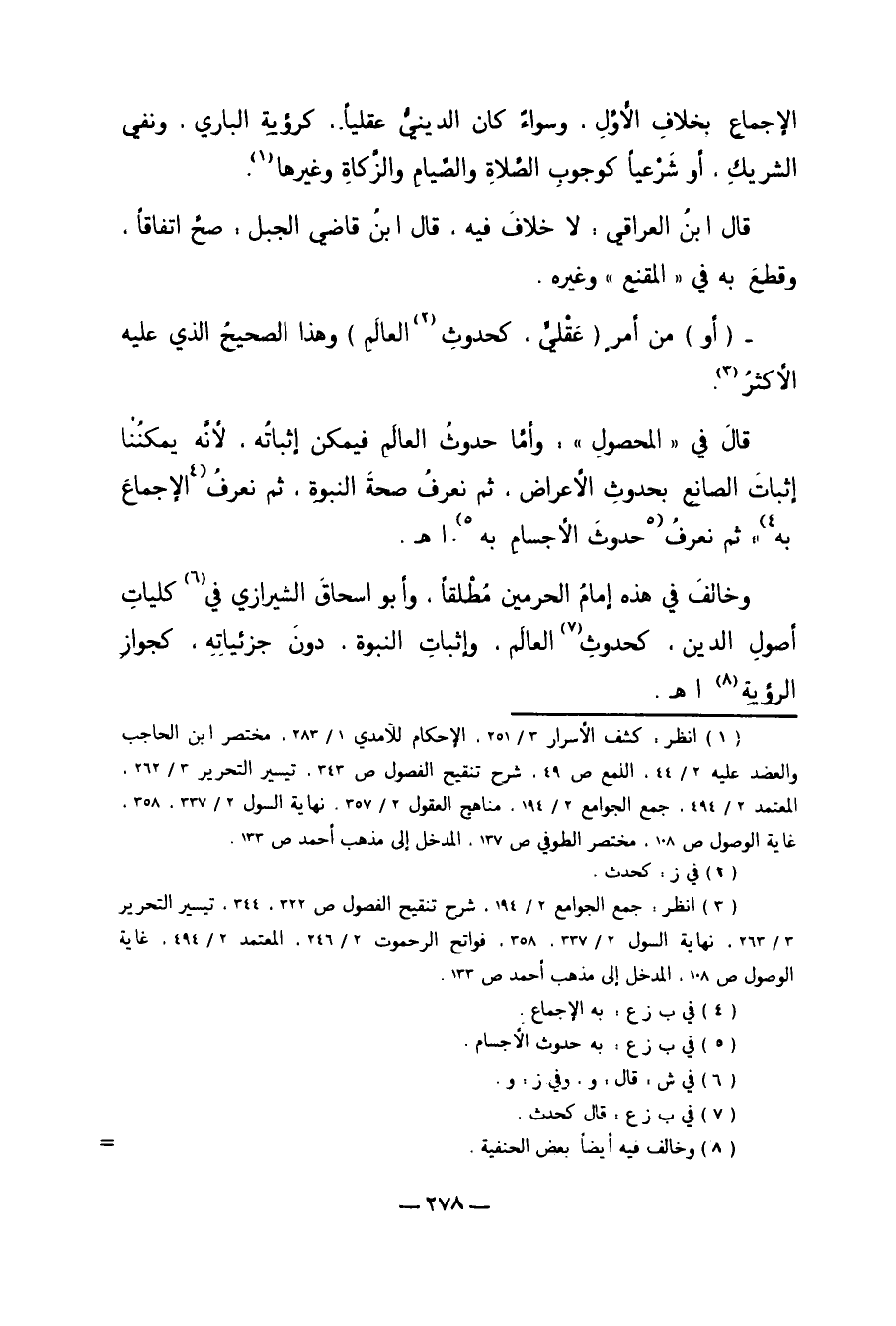 قَالَ فِي "الْمَحْصُولِ": وَأَمَّا حُدُوثُ الْعَالَمِ فَيُمْكِنُ إثْبَاتُهُ: لأَنَّهُ يُمْكِنُنَا إثْبَاتُ الصَّانِعِ بِحُدُوثِ الأَعْرَاضِ، ثُمَّ نَعْرِفُ صِحَّةَ النُّبُوَّةِ، ثُمَّ نَعْرِفُ 4الإِجْمَاعَ بِهِ8؛ ثُمَّ نَعْرِفُ 5حُدُوثَ الأَجْسَامِ بِهِ9. اهـ.