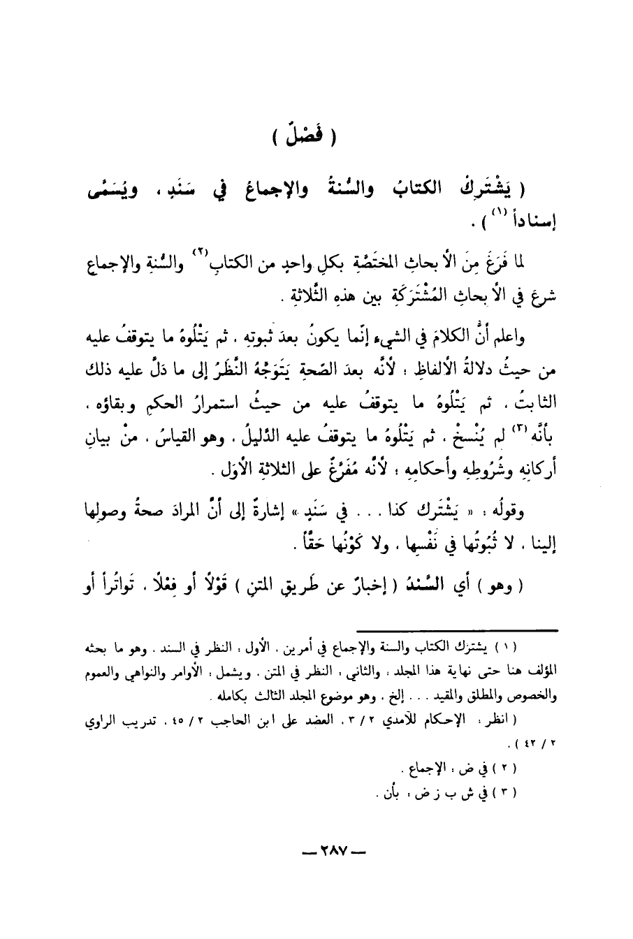 "فَصْلٌ": "يَشْتَرِكُ الْكِتَابُ وَالسُّنَّةُ وَالإِجْمَاعُ فِي سَنَدٍ، وَيُسَمَّى إسْنَادً ا 1".