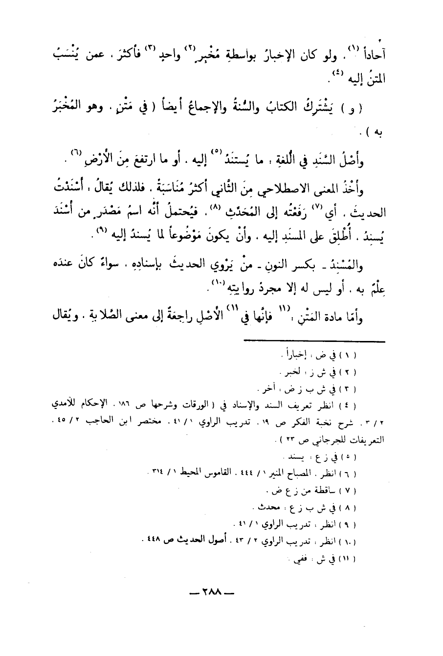 4 انظر تعريف السند والإسناد في الورقات وشرحها ص 186، الإحكام للآمدي 2/ 3، شرح نخبة الفكر ص 19، تدريب الراوي 1/ 41، مختصر ابن الحاجب 2/ 45، التعريفات للجرجاني ص 23.