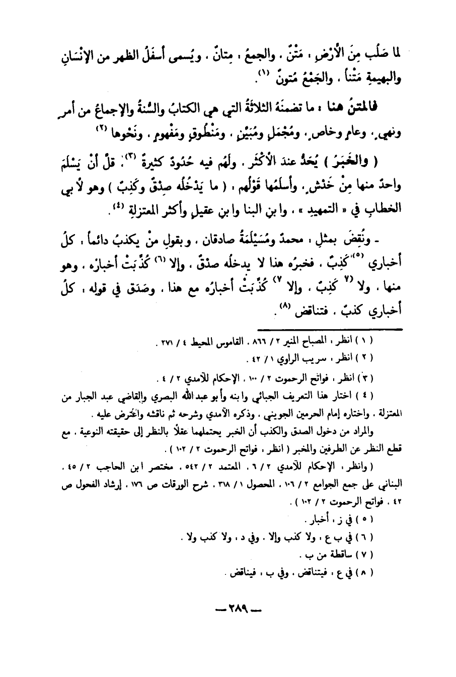 "وَالْخَبَرُ" يُحَدُّ عِنْدَ الأَكْثَرِ. وَلَهُمْ فِيهِ حُدُودٌ كَثِيرَةٌ3 قَلَّ أَنْ يَسْلَمَ وَاحِدٌ مِنْهَا مِنْ خَدْشٍ. وَأَسْلَمُهَا قَوْلُهُمْ "مَا يَدْخُلُهُ صِدْقٌ وَكَذِبٌ" وَهُوَ لأَبِي الْخَطَّابِ فِي "التَّمْهِيدِ"، وَابْنِ الْبَنَّا وَابْنِ عَقِيلٍ. وَأَكْثَرِ الْمُعْتَزِلَةِ4.
