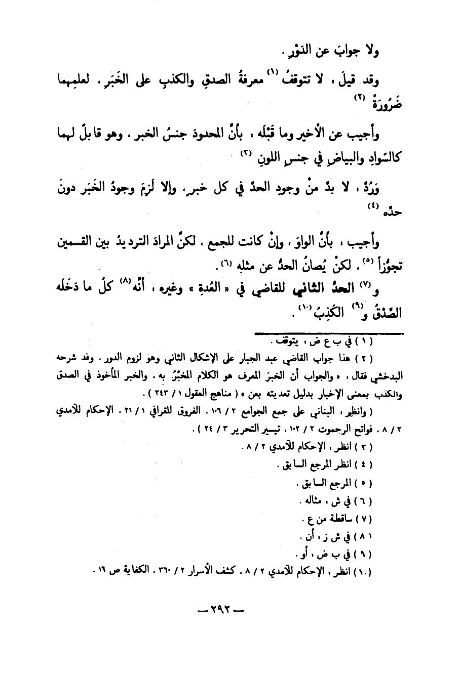 2 هذا جواب القاضي عبد الجبار على الإشكال الثاني وهو لزوم الدور، وقد شرحه البدخشي، فقال: "والجواب أن الخبر المعرف هو الكلام المخَبَّر به، والخبر المأخوذ في الصدق والكذب بمعنى الإخبار بدليل تعديته بعن". "مناهج العقول 1/ 243".