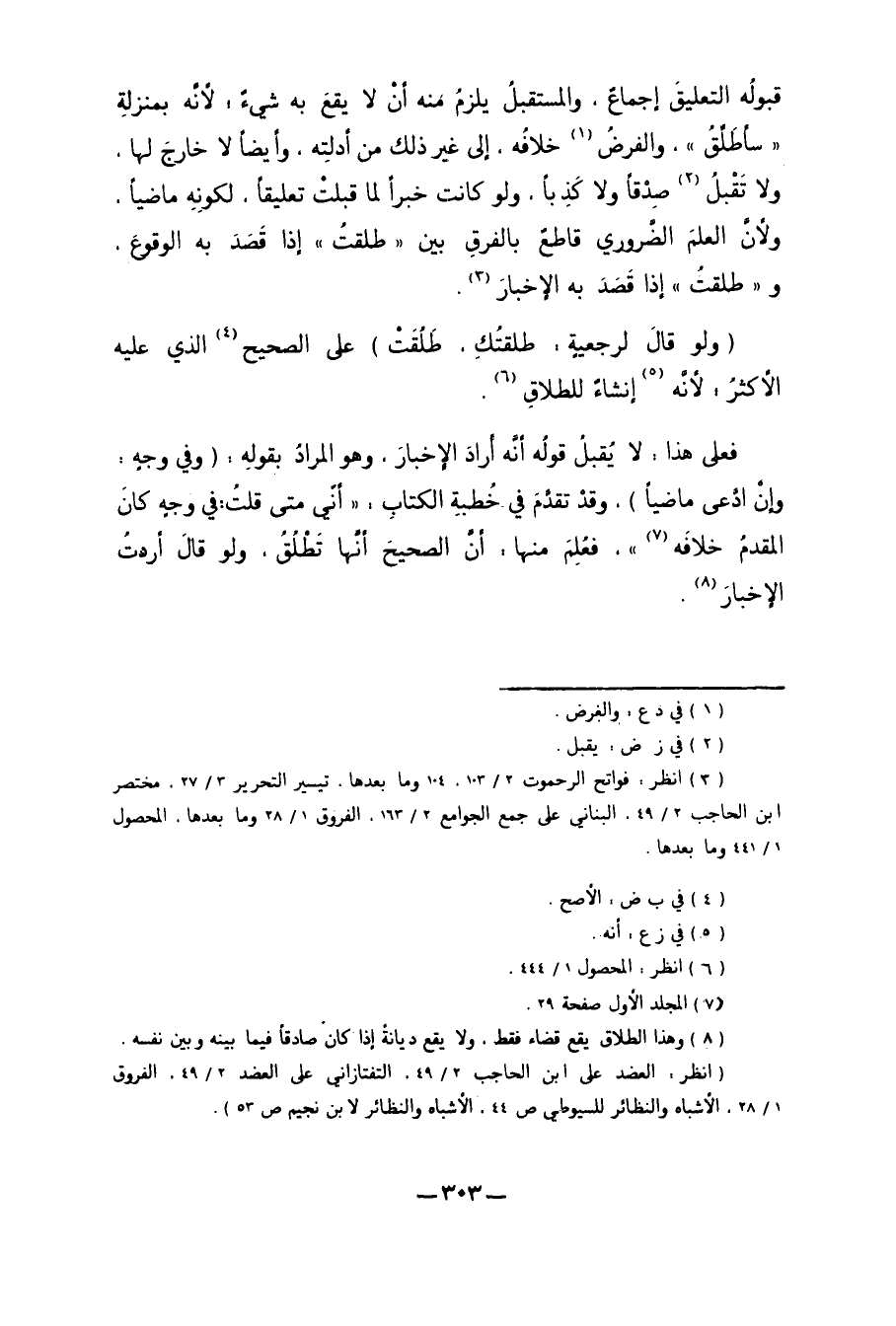فَعَلَى هَذَا: لا يُقْبَلُ قَوْلُهُ: أَنَّهُ أَرَادَ الإِخْبَارَ، وَهُوَ الْمُرَادُ بِقَوْلِهِ "وَفِي وَجْهٍ وَإِنْ ادَّعَى مَاضِيًا" وَقَدْ تَقَدَّمَ فِي خُطْبَةِ الْكِتَابِ "أَنِّي مَتَى قُلْت فِي وَجْهٍ: كَانَ الْمُقَدَّمُ خِلافَهُ7" فَعُلِمَ مِنْهَا: أَنَّ الصَّحِيحَ أَنَّهَا تَطْلُقُ، وَلَوْ قَالَ: أَرَدْت الإِخْبَارَ8.