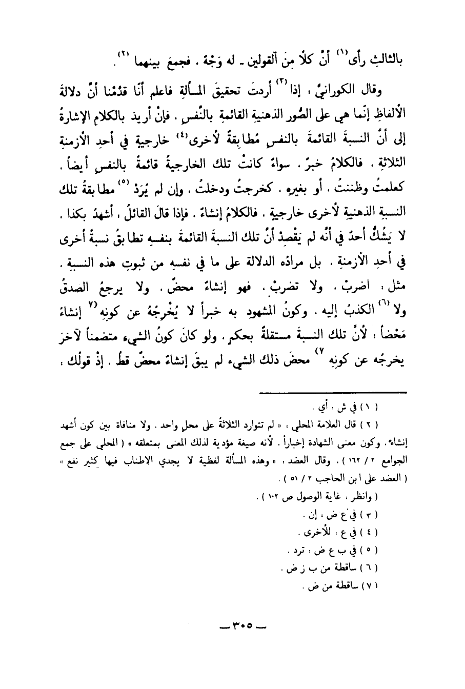 وَقَالَ الْكُورَانِيُّ: إذَا3 أَرَدْت تَحْقِيقَ الْمَسْأَلَةِ، فَاعْلَمْ أَنَّا قَدَّمْنَا أَنَّ دَلالَةَ الأَلْفَاظِ إنَّمَا هِيَ عَلَى الصُّوَرِ الذِّهْنِيَّةِ الْقَائِمَةِ بِالنَّفْسِ. فَإِنْ أُرِيدَ بِالْكَلامِ الإِشَارَةُ إلَى أَنَّ النِّسْبَةَ الْقَائِمَةَ بِالنَّفْسِ مُطَابِقَةٌ لأُخْرَى4 خَارِجِيَّةٍ فِي أَحَدِ الأَزْمِنَةِ الثَّلاثَةِ. فَالْكَلامُ خَبَرٌ، سَوَاءٌ كَانَتْ تِلْكَ الْخَارِجِيَّةُ قَائِمَةً بِالنَّفْسِ أَيْضًا، كَعَلِمْتُ وَظَنَنْت. أَوْ بِغَيْرِهِ كَخَرَجْتُ وَدَخَلْت، وَإِنْ لَمْ يُرَدْ5 مُطَابَقَةُ تِلْكَ النِّسْبَةِ الذِّهْنِيَّةِ لأُخْرَى خَارِجِيَّةٍ. فَالْكَلامُ إنْشَاءٌ. فَإِذَا قَالَ الْقَائِلُ: أَشْهَدُ بِكَذَا. لا يَشُكُّ أَحَدٌ فِي أَنَّهُ لَمْ يَقْصِدْ أَنَّ تِلْكَ النِّسْبَةَ الْقَائِمَةَ بِنَفْسِهِ تُطَابِقُ نِسْبَةً أُخْرَى فِي أَحَدِ الأَزْمِنَةِ، بَلْ مُرَادُهُ الدَّلالَةُ عَلَى مَا فِي نَفْسِهِ مِنْ ثُبُوتِ هَذِهِ النِّسْبَةِ. مِثْلُ: اضْرِبْ، وَلا تَضْرِبْ. فَهُوَ إنْشَاءٌ مَحْضٌ، وَلا يَرْجِعُ الصِّدْقُ وَلا6 الْكَذِبُ إلَيْهِ، وَكَوْنُ الْمَشْهُودِ بِهِ خَبَرًا لا يُخْرِجُهُ عَنْ كَوْنِهِ 7إنْشَاءً مَحْضًا؛ لأَنَّ تِلْكَ النِّسْبَةَ مُسْتَقِلَّةٌ بِحُكْمٍ، وَلَوْ كَانَ كَوْنُ الشَّيْءِ مُتَضَمِّنًا لآخَرَ يُخْرِجُهُ عَنْ كَوْنِهِ7 مَحْضُ ذَلِكَ الشَّيْءِ لَمْ يَبْقَ إنْشَاءٌ مَحْضٌ قَطُّ إذْ قَوْلُك: