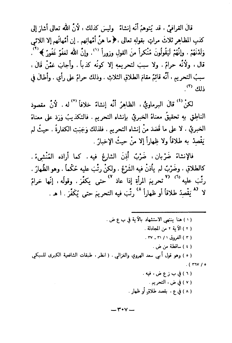 قَالَ الْقَرَافِيُّ: قَدْ يُتَوَهَّمُ أَنَّهُ إنْشَاءٌ وَلَيْسَ كَذَلِكَ لأَنَّ اللَّهَ تَعَالَى أَشَارَ إلَى كَذِبِ الْمُظَاهِرِ ثَلاثَ مَرَّاتٍ بِقَوْلِهِ تَعَالَى: {مَا هُنَّ أُمَّهَاتِهِمْ إنْ أُمَّهَاتُهُمْ إلاَّ اللاَّئِي وَلَدْنَهُمْ وَإِنَّهُمْ لَيَقُولُونَ مُنْكَرًا مِنْ الْقَوْلِ وَزُورًا 1 وَإِنَّ اللَّهَ لَعَفُوٌّ غَفُورٌ} 2 قَالَ: وَلأَنَّهُ حَرَامٌ وَلا سَبَبَ لِتَحْرِيمِهِ إلاَّ كَوْنُهُ كَذِبًا. وَأَجَابَ عَمَّنْ قَالَ: سَبَبُ التَّحْرِيمِ: أَنَّهُ قَائِمٌ مَقَامَ الطَّلاقِ الثَّلاثِ. وَذَلِكَ حَرَامٌ عَلَى رَأْيٍ وَأَطَالَ فِي ذَلِكَ3.