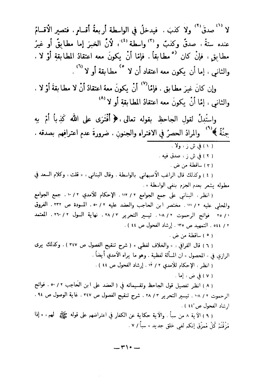 وَاسْتُدِلَّ لِقَوْلِ الْجَاحِظِ بِقَوْلِهِ تَعَالَى: {أَفْتَرَى عَلَى اللَّهِ كَذِبًا أَمْ بِهِ جِنَّةٌ} 9. وَالْمُرَادُ الْحَصْرُ فِي الافْتِرَاءِ وَالْجُنُونِ، ضَرُورَةَ عَدَمِ اعْتِرَافِهِمْ بِصِدْقِهِ.