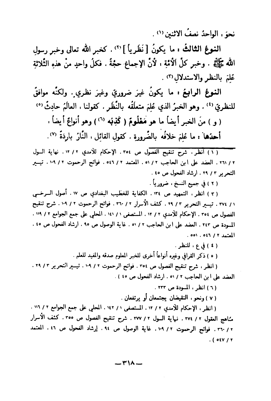 النَّوْعُ الرَّابِعُ: مَا يَكُونُ غَيْرَ ضَرُورِيٍّ وَغَيْرَ نَظَرِيٍّ، وَلَكِنَّهُ مُوَافِقٌ لِلنَّظَرِيِّ4، وَهُوَ الْخَبَرُ الَّذِي عُلِمَ مُتَعَلَّقُهُ بِالنَّظَرِ. كَقَوْلِنَا: الْعَالَمُ حَادِثٌ5 "وَ" مِنْ الْخَبَرِ أَيْضًا مَا هُوَ مَعْلُومٌ "كَذِبُهُ6" وَهُوَ أَنْوَاعٌ أَيْضًا.
