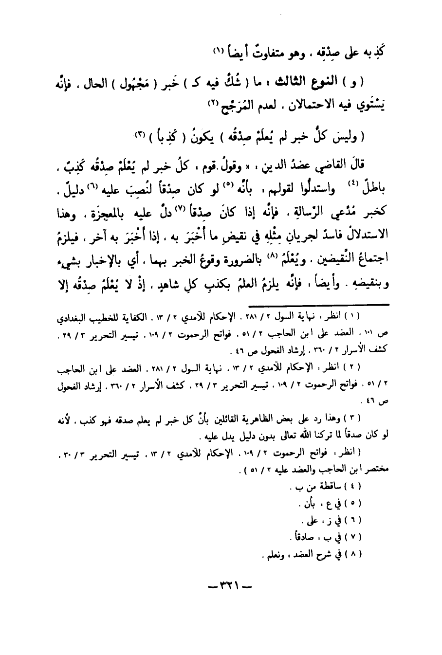 قَالَ الْقَاضِي عَضُدُ الدِّينِ: "وَقَوْلُ قَوْمٍ: كُلُّ خَبَرٍ لَمْ يُعْلَمْ صِدْقُهُ كَذِبٌ بَاطِلٌ4. وَاسْتَدَلُّوا لِقَوْلِهِمْ بِأَنَّهُ5 لَوْ كَانَ صِدْقًا لَنُصِبَ عَلَيْهِ6 دَلِيلٌ، كَخَبَرِ مُدَّعِي الرِّسَالَةِ. فَإِنَّهُ إذَا كَانَ صِدْقًا7 دَلَّ عَلَيْهِ بِالْمُعْجِزَةِ. وَهَذَا الاسْتِدْلال فَاسِدٌ، لِجَرَيَانِ مِثْلِهِ فِي نَقِيضِ مَا أَخْبَرَ بِهِ إذَا أَخْبَرَ بِهِ آخَرُ. فَيَلْزَمُ اجْتِمَاعُ النَّقِيضَيْنِ، وَيُعْلَمُ8 بِالضَّرُورَةِ وُقُوعُ الْخَبَرِ بِهِمَا، أَيْ بِالإِخْبَارِ بِشَيْءٍ وَبِنَقِيضِهِ. وَأَيْضًا فَإِنَّهُ يَلْزَمُ الْعِلْمُ بِكَذِبِ كُلِّ شَاهِدٍ؛ إذْ لا يُعْلَمُ صِدْقُهُ إلاَّ