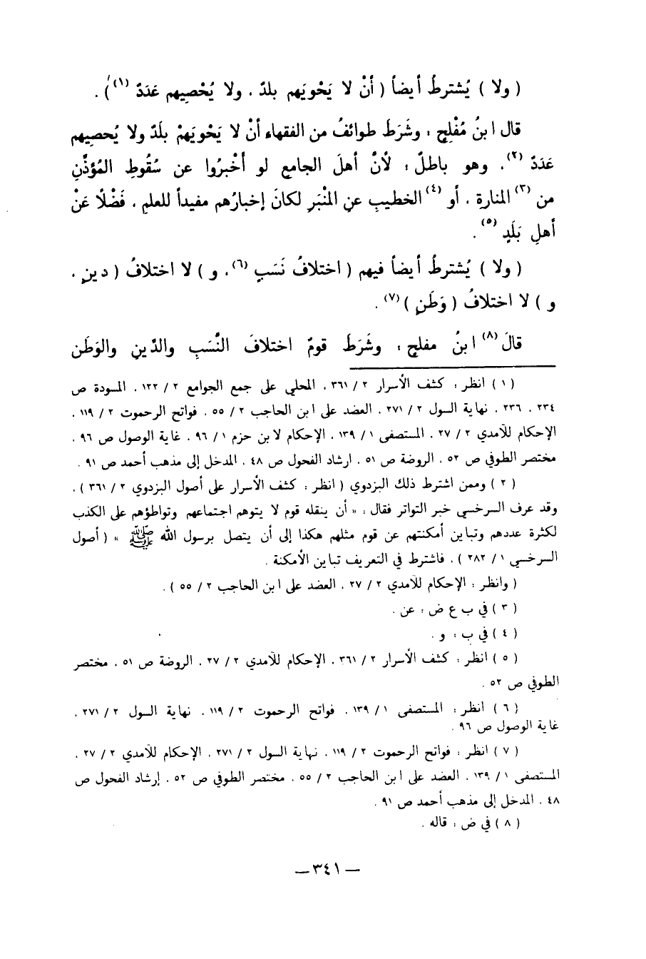 قَالَ ابْنُ مُفْلِحٍ: وَشَرَطَ طَوَائِفُ مِنْ الْفُقَهَاءِ أَنْ لا يَحْوِيَهُمْ بَلَدٌ وَلا يُحْصِيهِمْ عَدَدٌ2، وَهُوَ بَاطِلٌ. لأَنَّ أَهْلَ الْجَامِعِ لَوْ أَخْبَرُوا عَنْ سُقُوطِ الْمُؤَذِّنِ مِنَ3 الْمَنَارَةِ، أَوِ4 الْخَطِيبِ عَنْ الْمِنْبَرِ، لَكَانَ إخْبَارُهُمْ مُفِيدًا لِلْعِلْمِ فَضْلاً عَنْ أَهْلِ بَلَدٍ5.