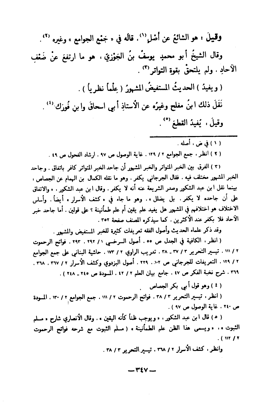 "انظر: الكافية في الجدل ص 55، أصول السرخسي 1/ 292، 293، فواتح الرحموت 2/ 111، تيسير التحرير 3/ 37- 38، تدريب الراوي 2/ 173، حاشية البناني على جمع الجوامع 2/ 129، التعريفات للجرجاني ص 102، 229، أصول البزدوي وكشف الأسرار 2/ 367، 368، 369، شرح نخبة الفكر ص 47، جامع بيان العلم 2/ 42، المسودة ص 245، 248".