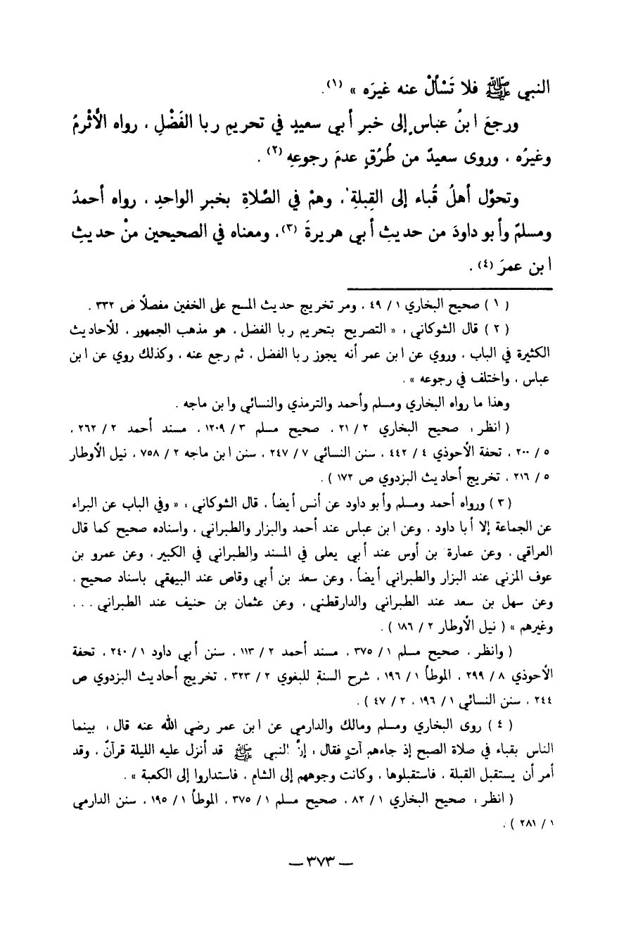 وَرَجَعَ ابْنُ عَبَّاسٍ إلَى خَبَرِ أَبِي سَعِيدٍ فِي تَحْرِيمِ رِبَا الْفَضْلِ. رَوَاهُ الأَثْرَمُ وَغَيْرُهُ. وَرَوَى سَعِيدٌ مِنْ طُرُقٍ عَدَمَ رُجُوعِهِ2. وَتَحَوَّلَ أَهْلِ قُبَاءَ إلَى الْقِبْلَةِ وَهُمْ فِي الصَّلاةِ بِخَبَرِ الْوَاحِدِ. رَوَاهُ أَحْمَدُ وَمُسْلِمٌ وَأَبُو دَاوُد مِنْ حَدِيثِ أَبِي هُرَيْرَةَ3. وَمَعْنَاهُ فِي الصَّحِيحَيْنِ مِنْ حَدِيثِ ابْنِ عُمَرَ4.