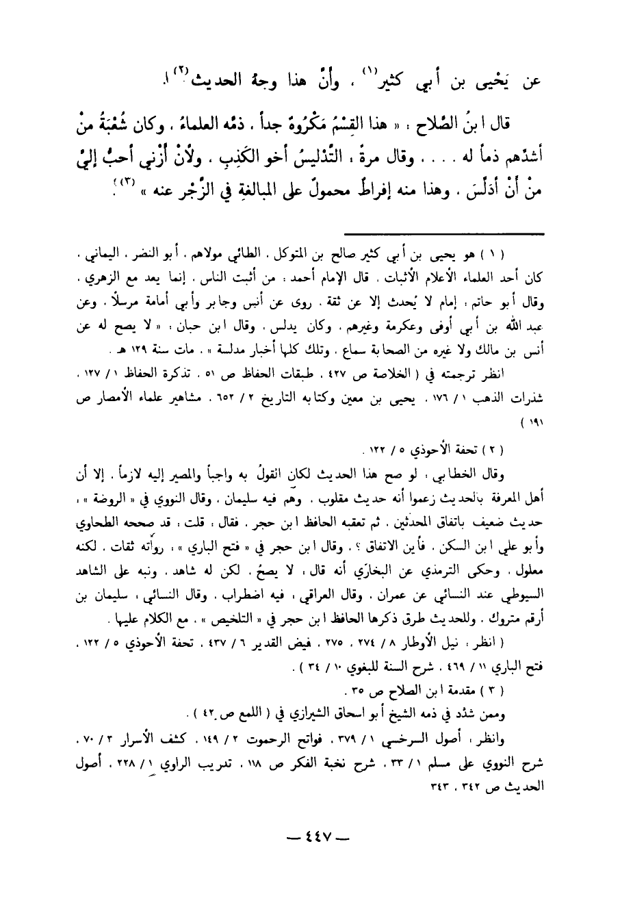 1 هو يحيى بن أبي كثير صالح بن المتوكل، الطائي مولاهم، أبو النضر، اليماني. كان أحد العلماء الأعلام الأثبات. قال أحمد: من أثبت الناس، إنما يعد مع الزهري. وقال أبو حاتم: إمام لا يحدث إلا عن ثقة. روى عن أنس وجابر وأبي أمامة مرسلاً، وعن عبد الله بن أبي أوفى وعكرمة وغيرهم. وكان يدلس. وقال ابن حبان: "لا يصح له عن أنس بن مالك ولا غيره من الصحابة سماع. وتلك كلها أخبار مدلسة". مات سنة 129 هـ.
