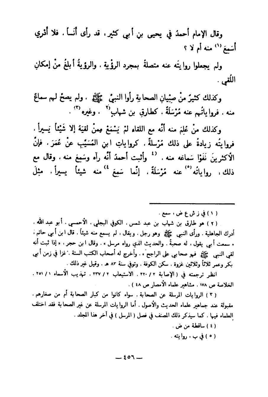 3 الروايات المرسلة عن الصحابة، سواء كانوا من كبار الصحابة أم من صغارهم، مقبولة عند جماهير علماء الحديث والأصول. أما الروايات المرسلة عن غير الصحابة فقد اختلف العلماء فيها، كما سيذكر ذلك المصنف في فصل "المرسل" في آخر هذا المجلد.4 ساقطة من ض.
