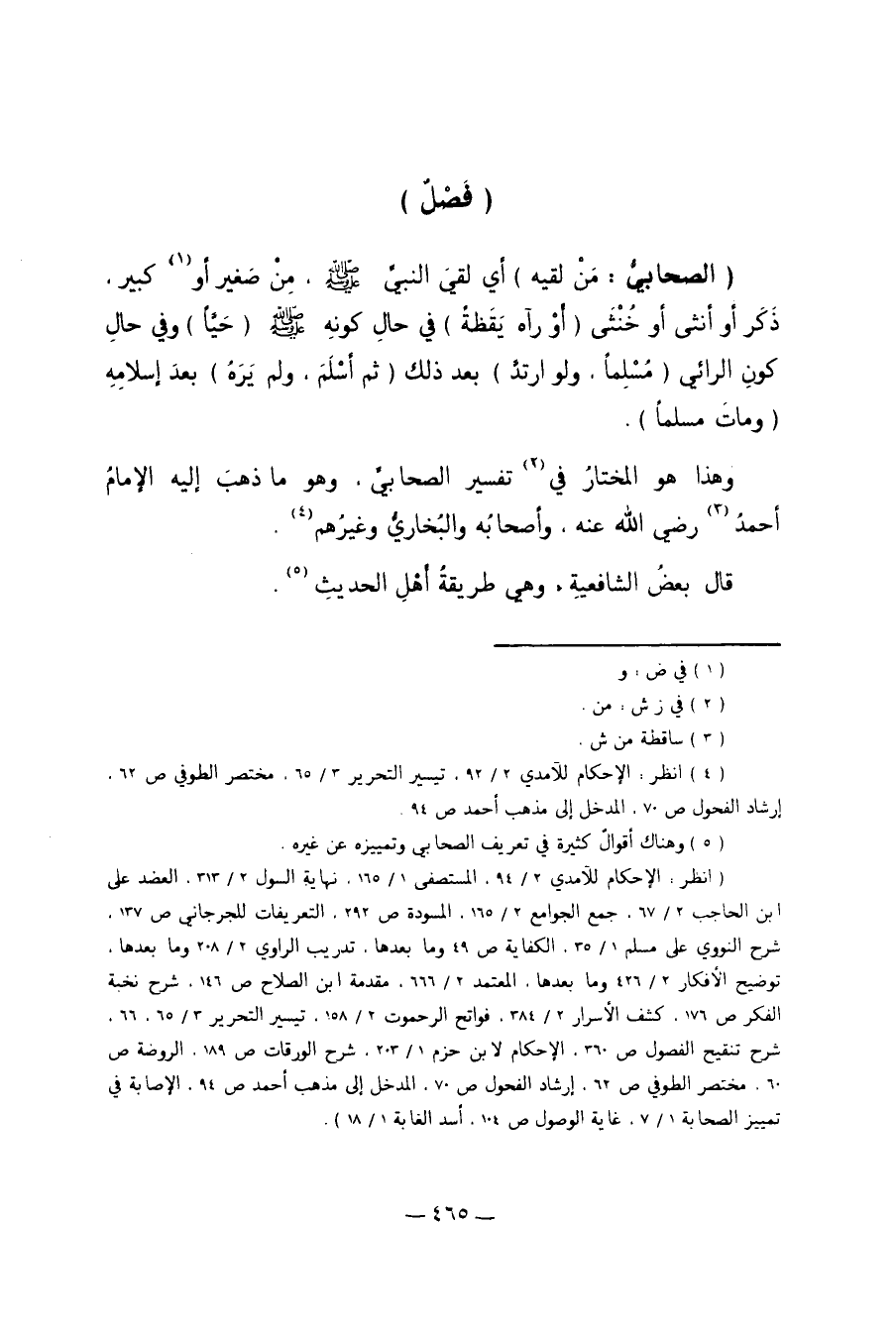 4 انظر: الإحكام للآمدي 2/ 92، تيسير التحرير 3/ 65، مختصر الطوفي ص 62، إرشاد الفحول ص 70، المدخل إلى مذهب أحمد ص 94.5 وهناك أقوال كثيرة في تعريف الصحابي وتمييزه عن غيره.