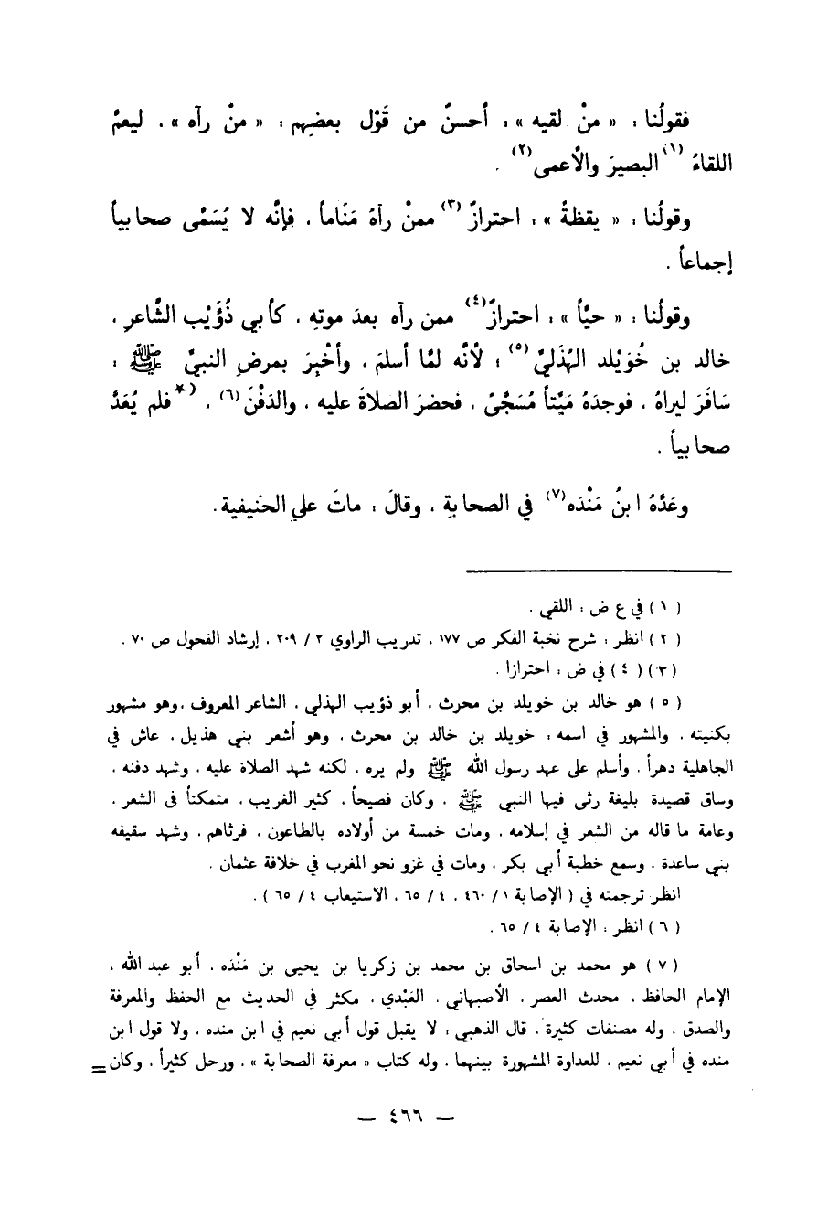 وَقَوْلُنَا: "حَيًّا" احْتِرَازٌ4 مِمَّنْ رَآهُ بَعْدَ مَوْتِهِ كَأَبِي ذُؤَيْبٍ الشَّاعِرِ خَالِدِ بْنِ خُوَيْلِدٍ الْهُذَلِيِّ5، لأَنَّهُ لَمَّا أَسْلَمَ وَأُخْبِرَ بِمَرَضِ النَّبِيِّ صَلَّى اللَّهُ عَلَيْهِ وَسَلَّمَ: سَافَرَ لِيَرَاهُ، فَوَجَدَهُ مَيِّتًا مُسَجَّى فَحَضَرَ الصَّلاةَ عَلَيْهِ وَالدَّفْنَ6.* فَلَمْ يُعَدَّ صَحَابِيًّا.