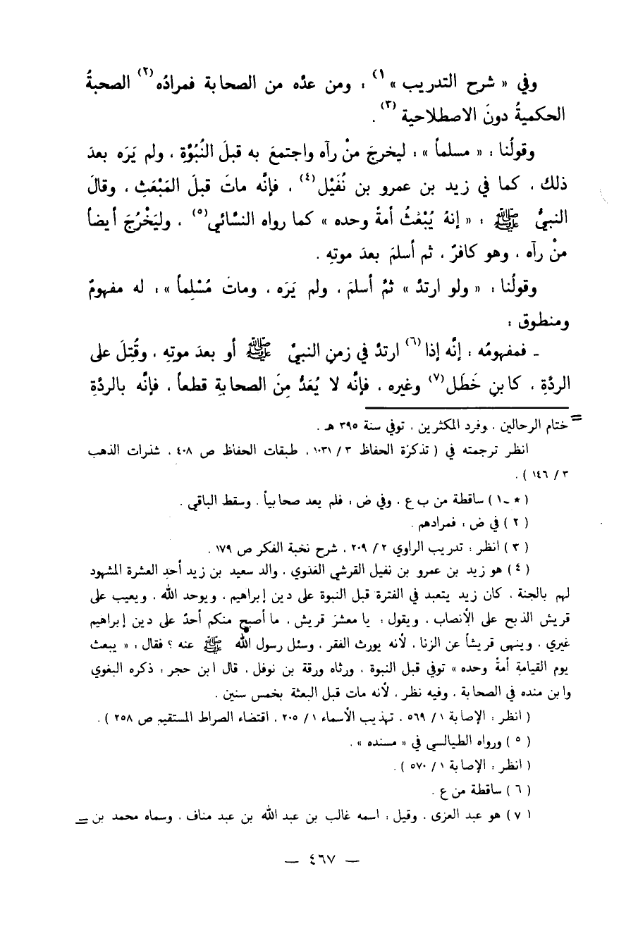 وَقَوْلُنَا "مُسْلِمًا" لِيَخْرُجَ مَنْ رَآهُ وَاجْتَمَعَ بِهِ قَبْلَ النُّبُوَّةِ وَلَمْ يَرَهُ بَعْدَ ذَلِكَ، كَمَا فِي زَيْدِ بْنِ عَمْرِو بْنِ نُفَيْلٍ4. فَإِنَّهُ مَاتَ قَبْلَ الْمَبْعَثِ. وَقَالَ النَّبِيُّ صَلَّى اللَّهُ عَلَيْهِ وَسَلَّمَ: "إنَّهُ يُبْعَثُ أُمَّةً وَحْدَهُ" كَمَا رَوَاهُ النَّسَائِيُّ5، وَلِيَخْرُجَ أَيْضًا مَنْ رَآهُ وَهُوَ كَافِرٌ، ثُمَّ أَسْلَمَ بَعْدَ مَوْتِهِ.