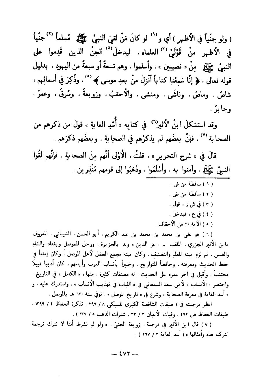 "وَلَوْ جِنِّيًّا فِي الأَظْهَرِ" أَيْ وَ1لَوْ كَانَ مَنْ لَقِيَ النَّبِيَّ صَلَّى اللَّهُ عَلَيْهِ وَسَلَّمَ مُسْلِمًا2 جِنِّيًّا فِي الأَظْهَرِ مِنْ قَوْلَيْ3 الْعُلَمَاءِ لِيَدْخُلَ4 الْجِنُّ الَّذِينَ قَدِمُوا عَلَى النَّبِيِّ صَلَّى اللَّهُ عَلَيْهِ وَسَلَّمَ مِنْ "نَصِيبِينَ" وَأَسْلَمُوا، وَهُمْ تِسْعَةٌ أَوْ سَبْعَةٌ مِنْ الْيَهُودِ بِدَلِيلِ قَوْله تَعَالَى {إنَّا سَمِعْنَا كِتَابًا أُنْزِلَ مِنْ بَعْدِ مُوسَى} 5 وَذُكِرَ فِي أَسْمَائِهِمْ: شَاصُ، وَمَاصُ، وَنَاشَى، وَمُنْشَى، وَالأَحْقَبُ، وَزَوْبَعَةُ، وَسُرَّقُ، وَعُمَرُ، وَجَابِرٌ.