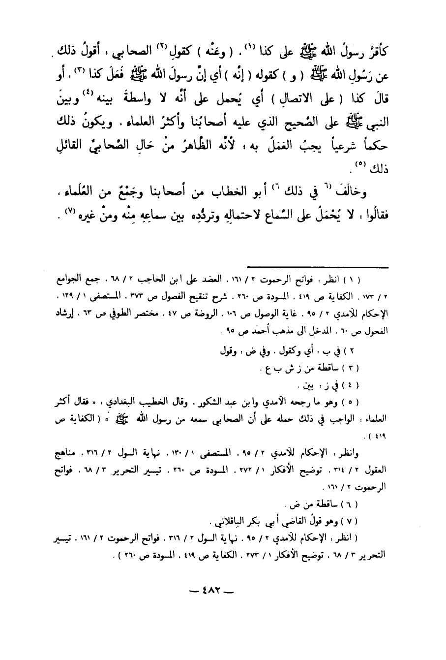 5 وهو ما رجحه الآمدي وابن عبد الشكور. وقال الخطيب البغدادي: "فقال أكثر العلماء: الواجب في ذلك حمله على أن الصحابي سمعه من رسول الله صلى الله عليه وسلم" "الكفاية ص 419".