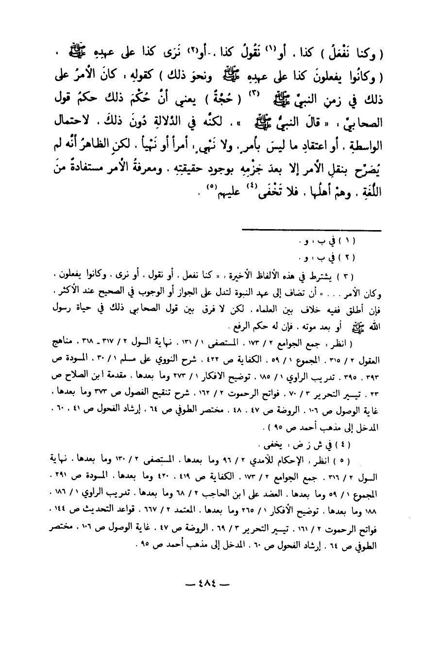 "وَكُنَّا نَفْعَلُ" كَذَا أَوْ1 نَقُولُ كَذَا، أَوْ2 نَرَى كَذَا عَلَى عَهْدِهِ صَلَّى اللَّهُ عَلَيْهِ وَسَلَّمَ، "وَكَانُوا يَفْعَلُونَ كَذَا عَلَى عَهْدِهِ صَلَّى اللَّهُ عَلَيْهِ وَسَلَّمَ وَنَحْوَ ذَلِكَ" كَقَوْلِهِ: كَانَ الأَمْرُ عَلَى ذَلِكَ فِي زَمَنِ النَّبِيِّ صَلَّى اللَّهُ عَلَيْهِ وَسَلَّمَ3 "حُجَّةٌ" يَعْنِي أَنَّ حُكْمَ ذَلِكَ حُكْمُ قَوْلِ الصَّحَابِيِّ "قَالَ النَّبِيُّ صَلَّى اللَّهُ عَلَيْهِ وَسَلَّمَ" لَكِنَّهُ فِي الدَّلالَةِ دُونَ ذَلِكَ، لاحْتِمَالِ الْوَاسِطَةِ أَوْ اعْتِقَادِ مَا لَيْسَ بِأَمْرٍ وَلا نَهْيٍ: أَمْرًا أَوْ نَهْيًا، لَكِنَّ الظَّاهِرَ أَنَّهُ لَمْ يُصَرِّحْ بِنَقْلِ الأَمْرِ إلاَّ بَعْدَ جَزْمِهِ بِوُجُودِ حَقِيقَتِهِ، وَمَعْرِفَةُ الأَمْرِ مُسْتَفَادَةٌ مِنْ اللُّغَةِ وَهُمْ أَهْلُهَا، فَلا تَخْفَى4 عَلَيْهِمْ5.