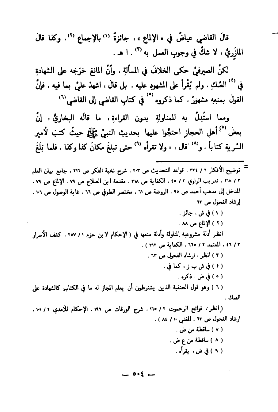 لَكِنَّ الصَّيْرَفِيَّ حَكَى الْخِلافَ فِي الْمَسْأَلَةِ. وَأَنَّ الْمَانِعَ خَرَّجَهُ عَلَى الشَّهَادَةِ، فِي4 الصَّكِّ وَلَمْ يَقْرَأْ عَلَى الْمَشْهُودِ عَلَيْهِ، بَلْ قَالَ: اشْهَدْ عَلَيَّ بِمَا فِيهِ، فَإِنَّ الْقَوْلَ بِمَنْعِهِ مَشْهُورٌ. كَمَا ذَكَرُوهُ5 فِي كِتَابِ الْقَاضِي إلَى الْقَاضِي6. وَمِمَّا اُسْتُدِلَّ بِهِ لِلْمُنَاوَلَةِ بِدُونِ الْقِرَاءَةِ مَا قَالَهُ الْبُخَارِيُّ: إنَّ بَعْضَ7 أَهْلِ الْحِجَازِ احْتَجُّوا عَلَيْهَا بِحَدِيثِ النَّبِيِّ صَلَّى اللَّهُ عَلَيْهِ وَسَلَّمَ حَيْثُ كَتَبَ لأَمِيرِ السَّرِيَّةِ كِتَابًا. وَ8قَالَ: "وَلا تَقْرَأْهُ 9 حَتَّى تَبْلُغَ مَكَانَ كَذَا وَكَذَا". فَلَمَّا بَلَغَ