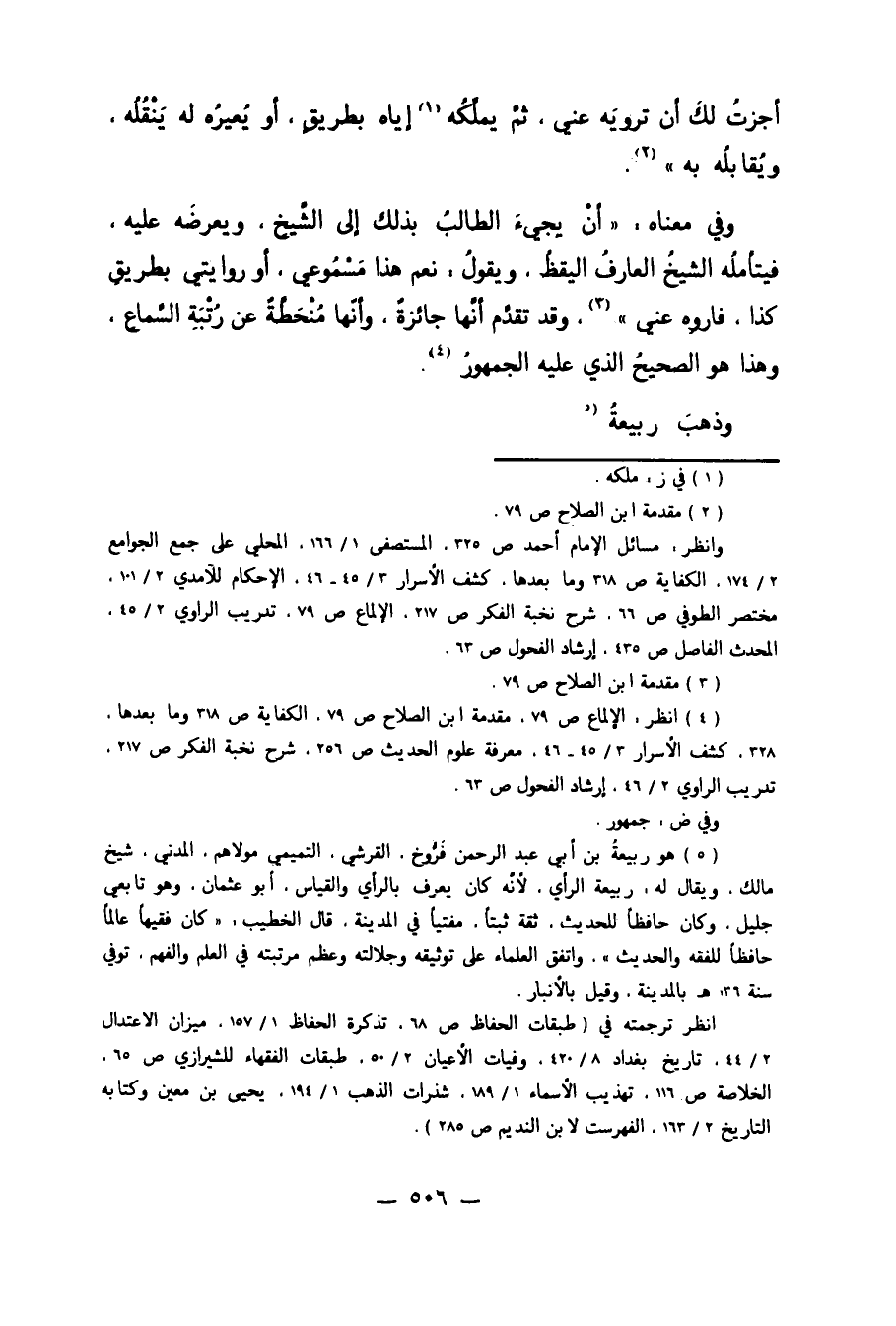 5 هو ربيعة بن أبي عبد الرحمن فرُّوخ، القرشي، التميمي مولاهم، المدني، شيخ مالك، ويقال له ربيعة الرأي، لأنه كان يعرف بالرأي والقياس، أبو عثمان. وهو تابعي جليل، وكان حافظاً للحديث، ثقة ثبتاً، مفتياً في المدينة. قال الخطيب: "كان فقيهاً عالماً حافظاً للفقه والحديث". واتفق العلماء على توثيقه وجلالته وعظم مرتبته في العلم والفهم. توفي سنة 136 هـ بالمدينة، وقيل بالأنبار.