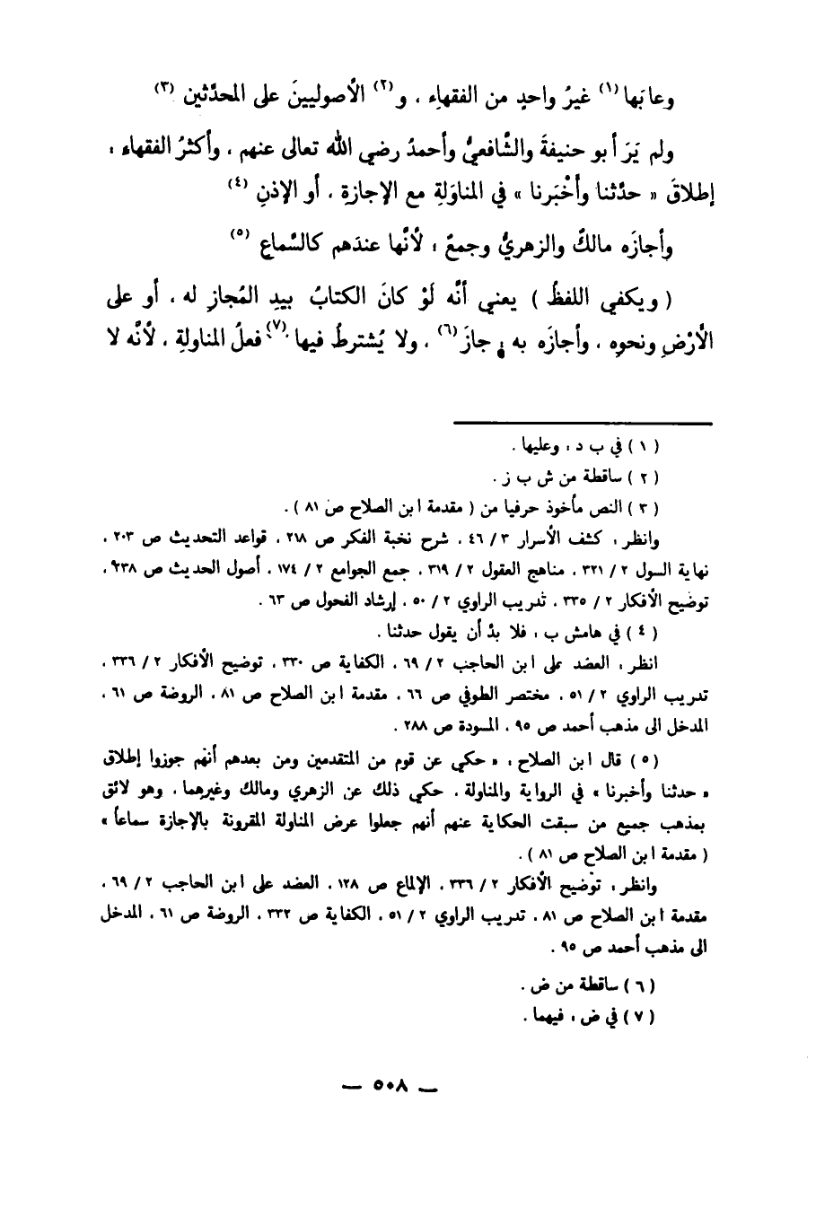 5 قال ابن الصلاح: "حكي عن قوم من المتقدمين ومن بعدهم أنهم جوزوا إطلاق "حدثنا وأخبرنا" في الرواية والمناولة. حكي ذلك عن الزهري ومالك وغيرهما, وهو لائق بمذهب جميع من سبقت الحكاية عنهم أنهم جعلوا عرض المناولة المقرونة بالإجازة سماعاً". "مقدمة ابن الصلاح ص 81".