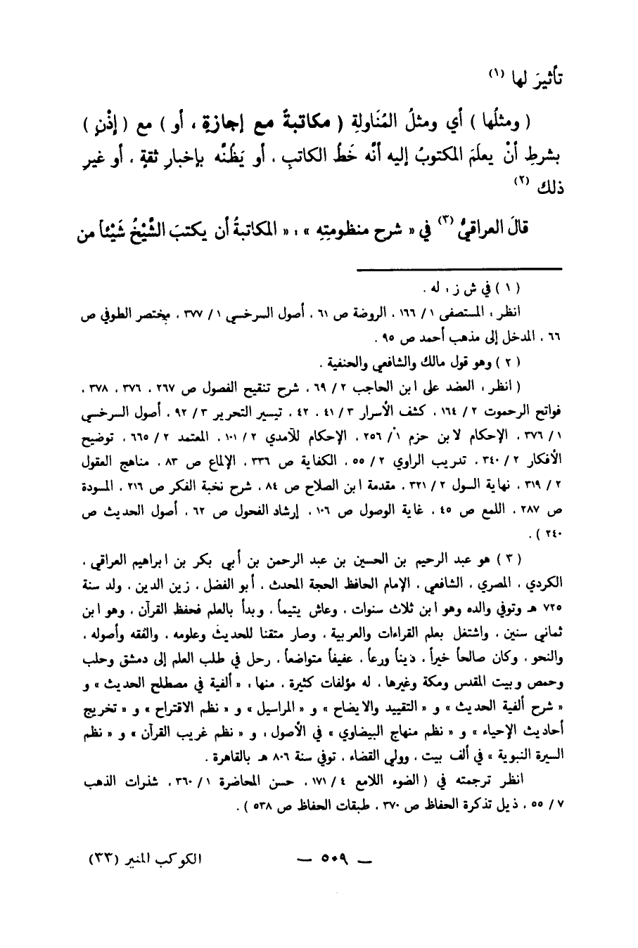 قَالَ الْعِرَاقِيُّ3 فِي "شَرْحِ مَنْظُومَتِهِ": "الْمُكَاتَبَةُ أَنْ يَكْتُبَ الشَّيْخُ شَيْئًا مِنْ