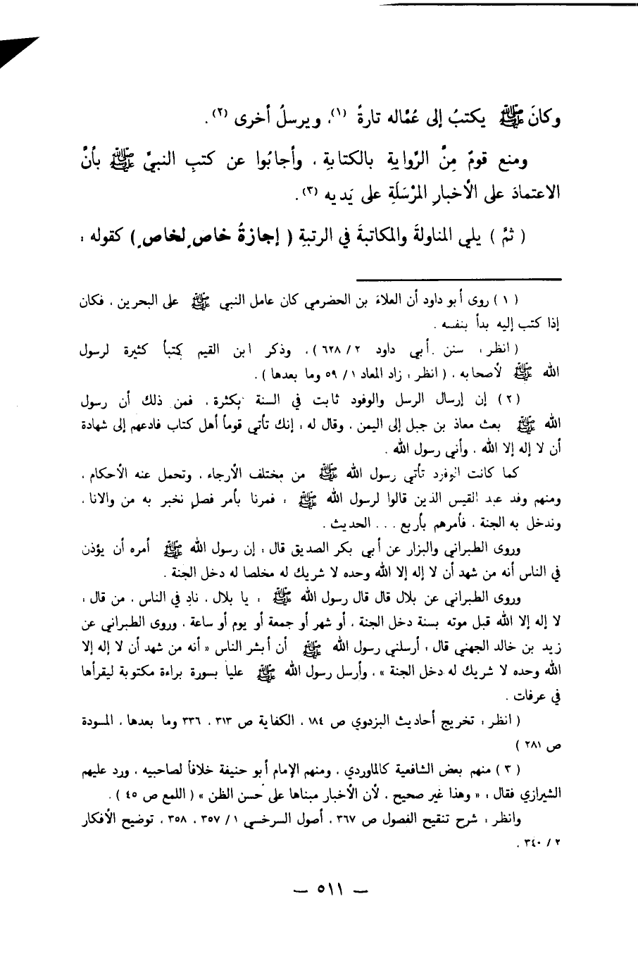 "انظر: سنن أبي داود 2/ 628". وذكر ابن القيم كتباً كثيرة لرسول الله صلى الله عليه وسلم لأصحابه. "انظر: زاد المعاد 1/ 59 وما بعدها".