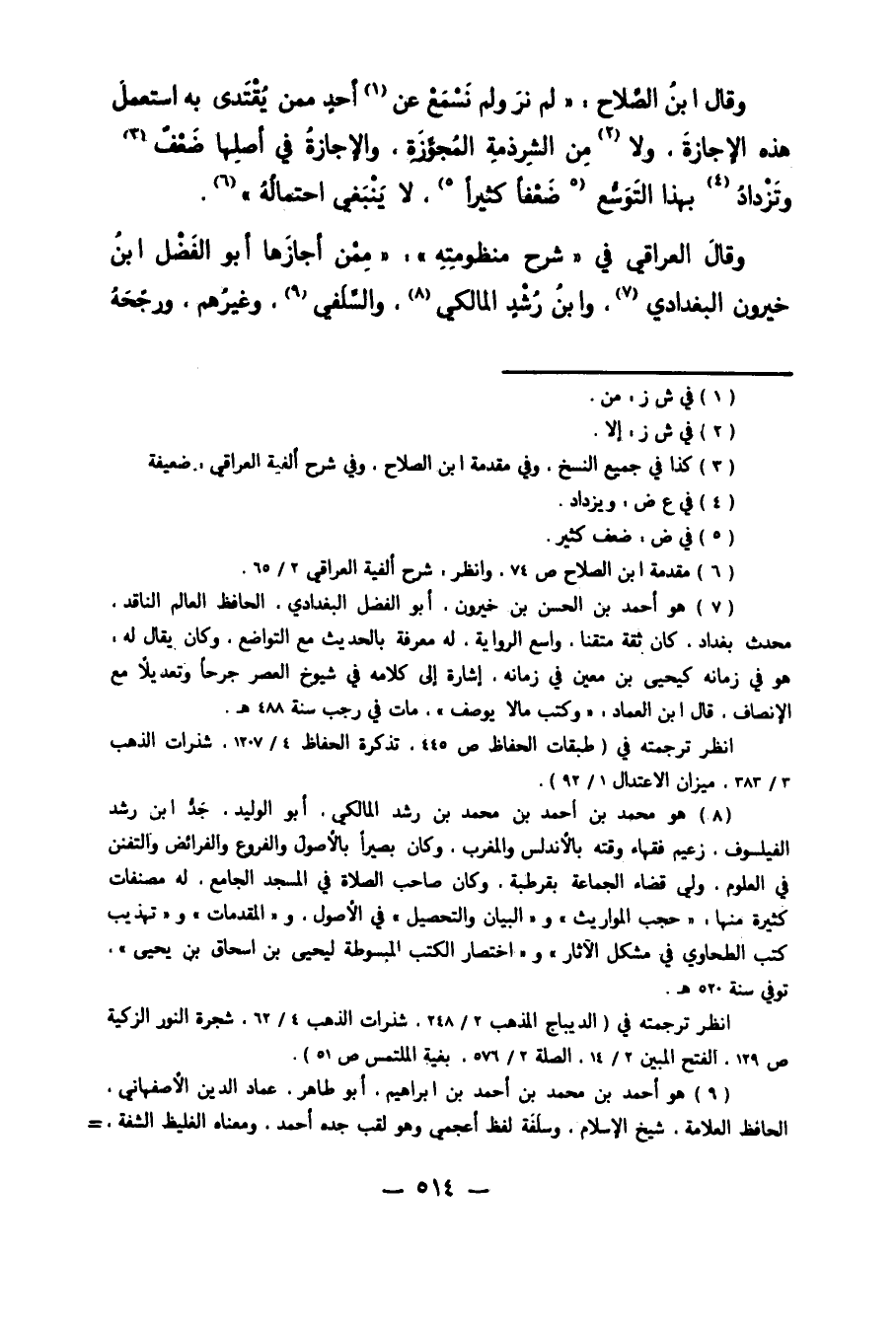 وَقَالَ الْعِرَاقِيُّ فِي "شَرْحِ مَنْظُومَتِهِ": "مِمَّنْ أَجَازَهَا أَبُو الْفَضْلِ ابْنُ خَيْرُونَ الْبَغْدَادِيُّ7 وَابْنُ رُشْدٍ الْمَالِكِيُّ8 وَالسَّلَفِيُّ9 وَغَيْرُهُمْ. وَرَجَّحَهُ