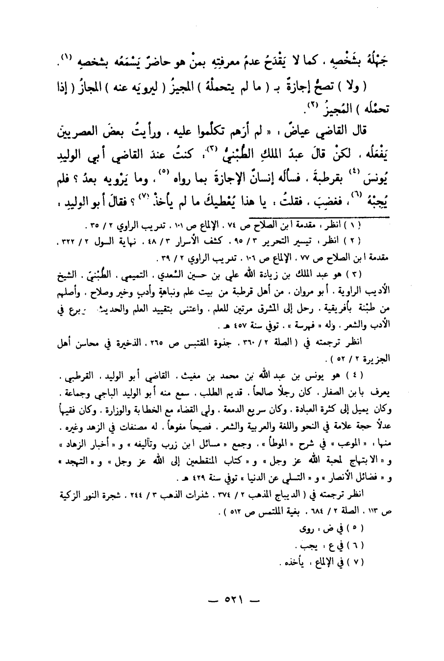 قَالَ الْقَاضِي عِيَاضٌ: "لَمْ أَرَهُمْ تَكَلَّمُوا عَلَيْهِ. وَرَأَيْت بَعْضَ الْعَصْرِيِّينَ يَفْعَلُهُ. لَكِنْ قَالَ عَبْدُ الْمَلِكِ الطُّبْنِيُّ3: كُنْت عِنْدَ الْقَاضِي أَبِي الْوَلِيدِ يُونُسَ4 بِقُرْطُبَةَ فَسَأَلَهُ إنْسَانٌ الإِجَازَةَ بِمَا رَوَاهُ5 وَمَا يَرْوِيهِ بَعْدُ؟ فَلَمْ يُجِبْهُ6 فَغَضِبَ. فَقُلْت: يَا هَذَا، يُعْطِيكَ مَا لَمْ يَأْخُذْ7؟ فَقَالَ أَبُو الْوَلِيدِ: