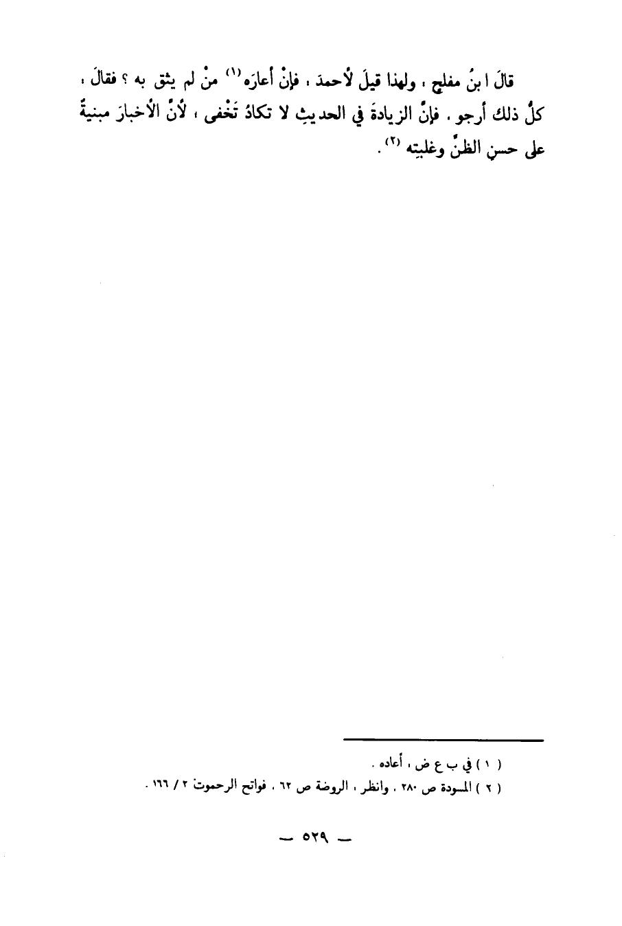 قَالَ ابْنُ مُفْلِحٍ: وَلِهَذَا قِيلَ لأَحْمَدَ: فَإِنْ أَعَارَهُ1 مَنْ لَمْ يَثِقْ بِهِ؟ فَقَالَ: كُلَّ ذَلِكَ أَرْجُو. فَإِنَّ الزِّيَادَةَ فِي الْحَدِيثِ لا تَكَادُ تَخْفَى؛ لأَنَّ الأَخْبَارَ مَبْنِيَّةٌ عَلَى حُسْنِ الظَّنِّ وَغَلَبَتِهِ2.