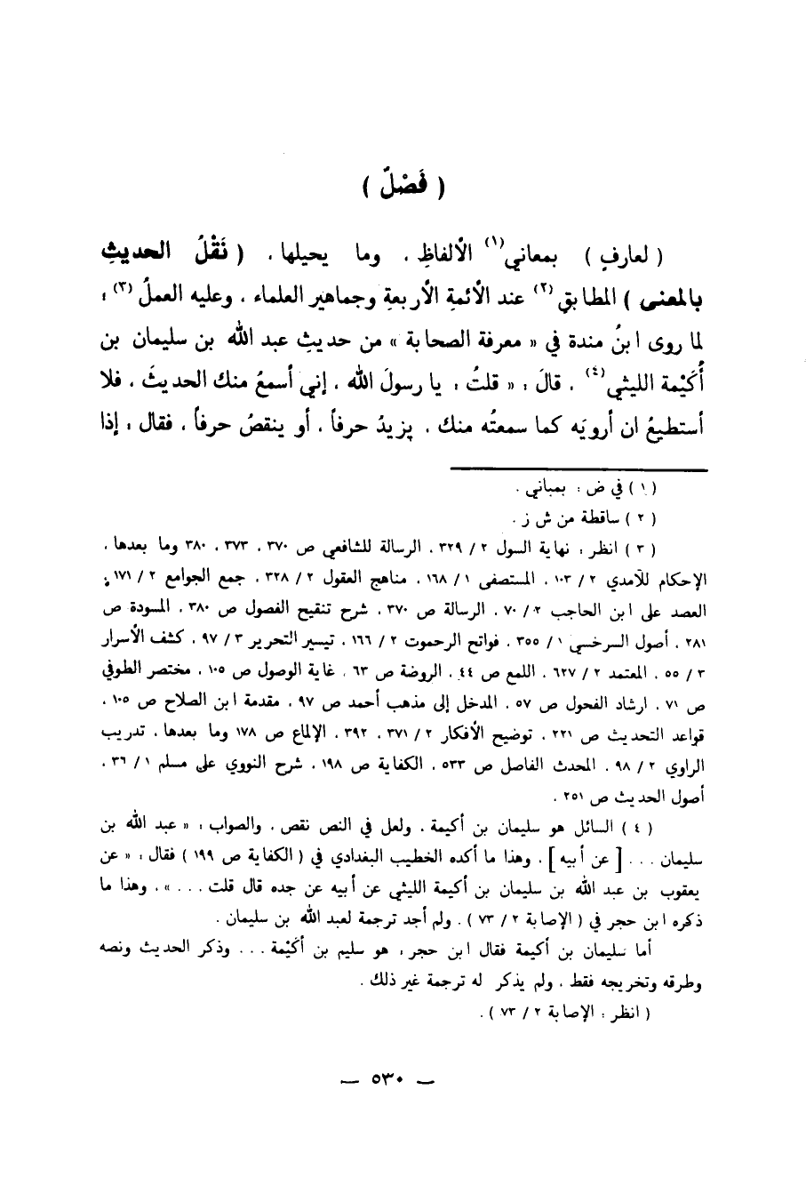 "لِعَارِفٍ" بِمَعَانِي1 الأَلْفَاظِ وَمَا يُحِيلُهَا "نَقْلُ الْحَدِيثِ بِالْمَعْنَى" الْمُطَابِقِ2 عِنْدَ الأَئِمَّةِ الأَرْبَعَةِ وَجَمَاهِيرِ الْعُلَمَاءِ. وَعَلَيْهِ الْعَمَلُ3، لِمَا رَوَى ابْنُ مَنْدَهْ فِي "مَعْرِفَةِ الصَّحَابَةِ" مِنْ حَدِيثِ عَبْدِ اللَّهِ بْنِ سُلَيْمَانَ بْنِ أُكَيْمَةَ اللَّيْثِيِّ4 قَالَ: "قُلْت: يَا رَسُولَ اللَّهِ، إنِّي أَسْمَعُ مِنْك الْحَدِيثَ، فَلا أَسْتَطِيعُ أَنْ أَرْوِيَهُ كَمَا سَمِعْته مِنْك، يُزِيدُ حَرْفًا أَوْ يُنْقِصُ حَرْفًا فَقَالَ: "إذَا