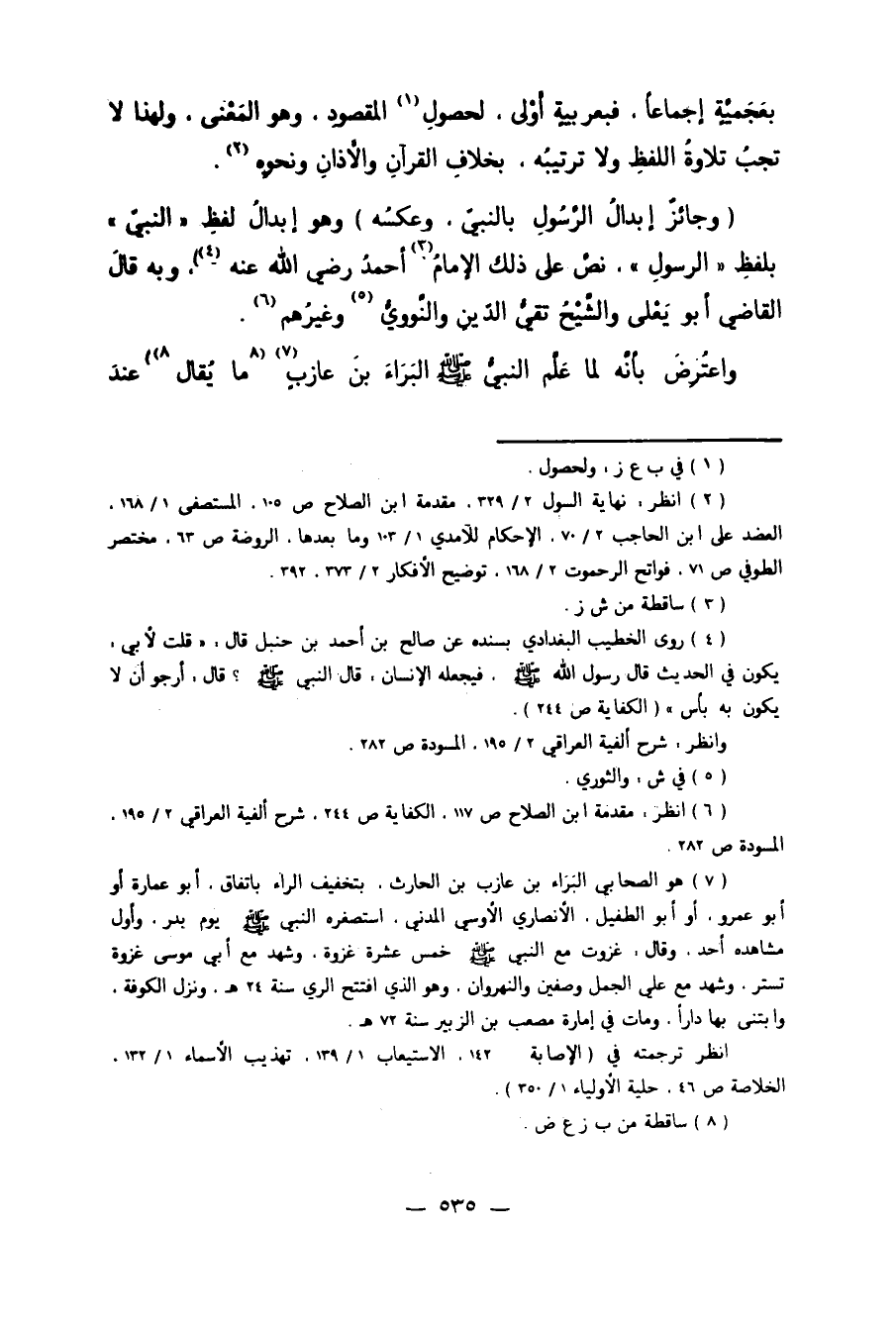 "وَجَائِزٌ إبْدَالُ الرَّسُولِ بِالنَّبِيِّ وَعَكْسُهُ" وَهُوَ إبْدَالُ لَفْظِ "النَّبِيِّ" بِلَفْظِ "الرَّسُولِ" نَصَّ عَلَى ذَلِكَ الإِمَامُ3 أَحْمَدُ رَضِيَ اللَّهُ عَنْهُ4. وَبِهِ قَالَ الْقَاضِي أَبُو يَعْلَى وَالشَّيْخُ تَقِيُّ الدِّينِ وَالنَّوَوِيُّ5 وَغَيْرُهُمْ6.