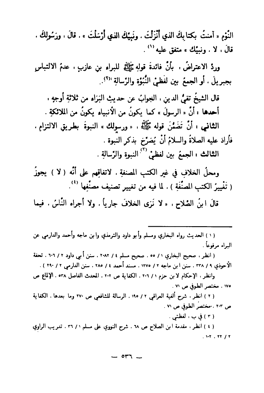 وَرُدَّ الاعْتِرَاضُ: بِأَنَّ فَائِدَةَ قَوْلِهِ صَلَّى اللَّهُ عَلَيْهِ وَسَلَّمَ لِلْبَرَاءِ بْنِ عَازِبٍ: عَدَمُ الالْتِبَاسِ بِجِبْرِيلَ أَوْ الْجَمْعُ بَيْنَ لَفْظَيْ النُّبُوَّةِ وَالرِّسَالَةِ2.قَالَ الشَّيْخُ تَقِيُّ الدِّينِ: الْجَوَابُ عَنْ حَدِيثِ الْبَرَاءِ مِنْ ثَلاثَةِ أَوْجُهٍ.
