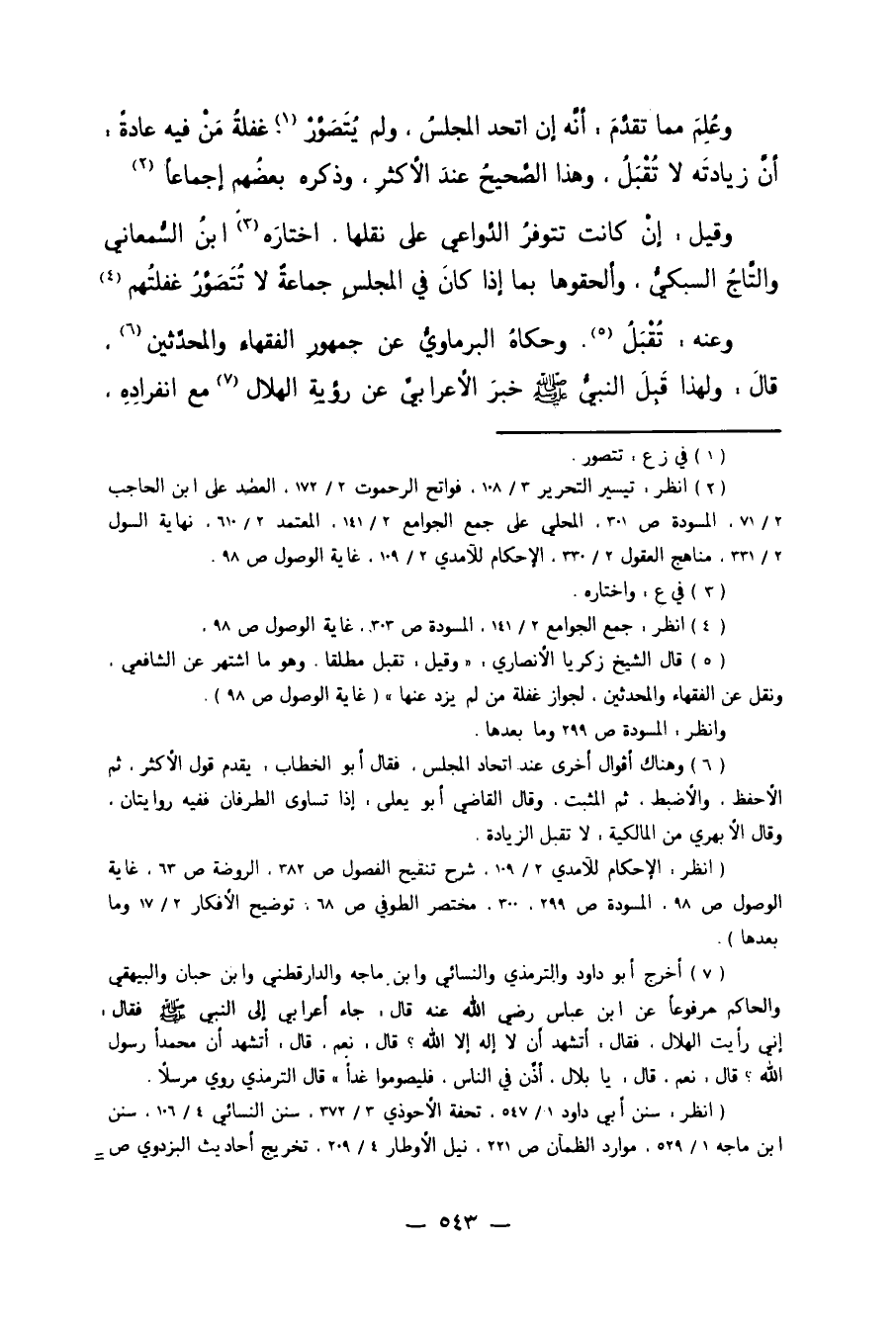 وَعُلِمَ مِمَّا تَقَدَّمَ: أَنَّهُ إنْ اتَّحَدَ الْمَجْلِسُ وَلَمْ يُتَصَوَّرْ1 غَفْلَةُ مَنْ فِيهِ عَادَةً: أَنَّ زِيَادَتَهُ لا تُقْبَلُ وَهَذَا الصَّحِيحُ عِنْدَ الأَكْثَرِ. وَذَكَرَهُ بَعْضُهُمْ إجْمَاعًا2.وَقِيلَ: إنْ كَانَتْ تَتَوَفَّرُ الدَّوَاعِي عَلَى نَقْلِهَا. اخْتَارَهُ3 ابْنُ السَّمْعَانِيِّ وَالتَّاجُ السُّبْكِيُّ وَأَلْحَقُوهَا بِمَا إذَا كَانَ فِي الْمَجْلِسُ جَمَاعَةٌ لا تُتَصَوَّرُ غَفْلَتُهُمْ4. وَعَنْهُ: تُقْبَلُ5. وَحَكَاهُ الْبِرْمَاوِيُّ عَنْ جُمْهُورِ الْفُقَهَاءِ وَالْمُحَدِّثِينَ6، قَالَ: وَلِهَذَا قَبِلَ النَّبِيُّ صَلَّى اللَّهُ عَلَيْهِ وَسَلَّمَ خَبَرَ الأَعْرَابِيِّ عَنْ رُؤْيَةِ الْهِلالِ7 مَعَ انْفِرَادِهِ.