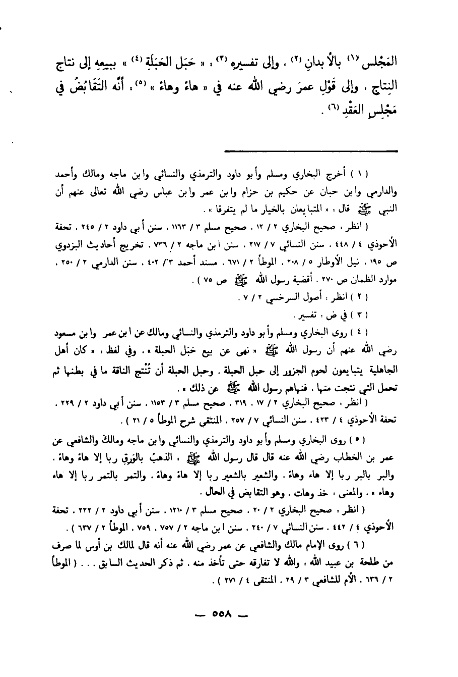 المجلس1 بالأبدان2، وإلى تفسيره3: "حبل الحبلة"4 ببيعه إلى نِتَاجِ النِّتاج، وإلى قول عمر رضي الله عنه في: "هاءً وهاءً" 5 أنه التقابُض في مجلس العقد6.