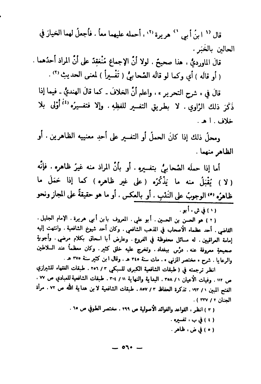 2 هو الحسن بن الحسين، أبو علي، المعروف بابن أبي هريرة، الإمام الجليل، القاضي، أحد عظماء الأصحاب في المذهب الشافعي، وكان أحد شيوخ الشافعية، وانتهت إليه إمامة العراقيين. له مسائل محفوظة في الفروع. وعارض أبا إسحاق بكلام مرضي، وأجوبة صحيحة معروفة عنه. درّس ببغداد، وتخرج عليه خلق كثير، وكان معظماً عند السلاطين والرعايا. شرح "مختصر المزني". مات سنة 345 هـ. وقال ابن كثير سنة 375 هـ.