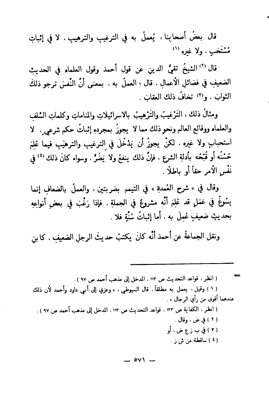 قَالَ2 الشَّيْخُ تَقِيُّ الدِّينِ عَنْ قَوْلِ أَحْمَدَ وَقَوْلِ الْعُلَمَاءِ فِي الْحَدِيثِ الضَّعِيفِ فِي فَضَائِلِ الأَعْمَالِ. قَالَ الْعَمَلُ بِهِ بِمَعْنَى أَنَّ النَّفْسَ تَرْجُو ذَلِكَ الثَّوَابَ، وَ3تَخَافُ ذَلِكَ الْعِقَابَ.