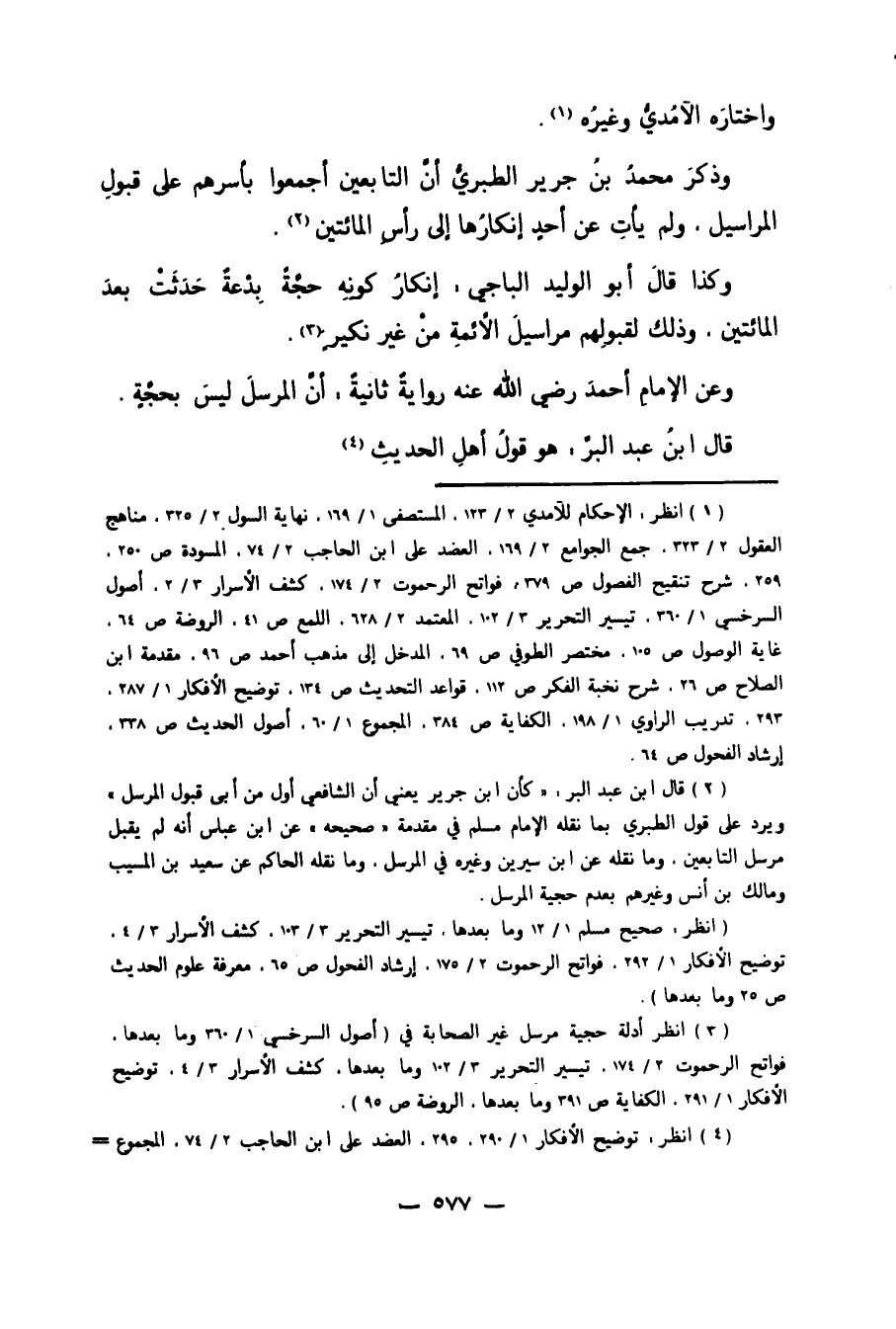 2 قال ابن عبد البر: "كأن ابن جرير يعني أن الشافعي أول من أبى قبول المرسل". ويرد على قول الطبري بما نقله عن الإمام مسلم في مقدمة "صحيحه" عن ابن عباس أنه لم يقبل مرسل التابعين، وما نقله عن ابن سيرين وغيره في المرسل، وما نقله الحاكم عن سعيد بن المسيب ومالك بن أنس وغيرهم بعدم حجية المرسل.