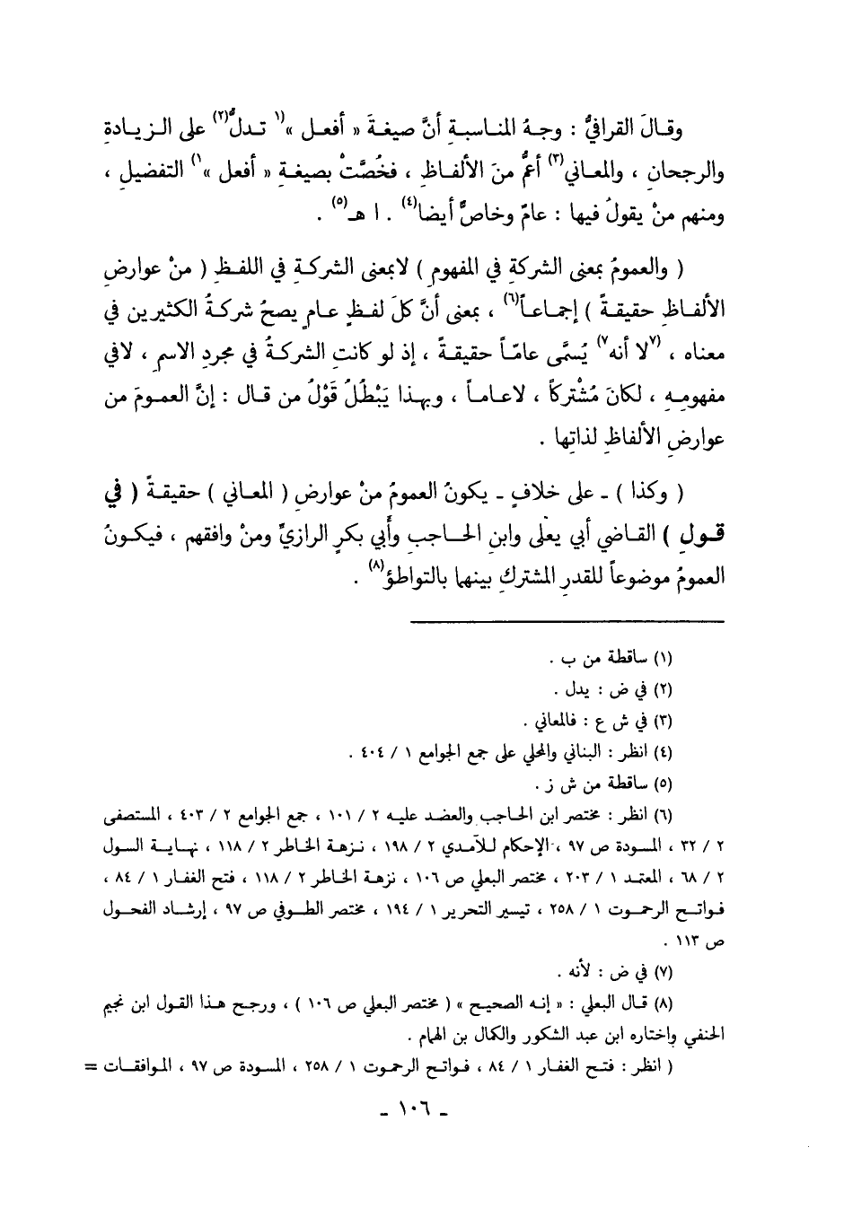 "وَالْعُمُومُ" بِمَعْنَى "الشَّرِكَةِ فِي الْمَفْهُومِ" لا بِمَعْنَى الشَّرِكَةِ فِي اللَّفْظِ "مِنْ عَوَارِضِ الأَلْفَاظِ حَقِيقَةً" إجْمَاعًا6، بِمَعْنَى أَنَّ كُلَّ لَفْظٍ عَامٍّ يَصِحُّ شَرِكَةُ الْكَثِيرِينَ فِي مَعْنَاهُ، لا أَنَّهُ7 يُسَمَّى عَامًّا حَقِيقَةً، إذْ لَوْ كَانَتْ الشَّرِكَةُ فِي مُجَرَّدِ الاسْمِ لا فِي مَفْهُومِهِ لَكَانَ مُشْتَرَكًا لا عَامًّا، وَبِهَذَا يَبْطُلُ قَوْلُ مَنْ قَالَ: إنَّ الْعُمُومَ مِنْ عَوَارِضِ الأَلْفَاظِ لِذَاتِهَا.