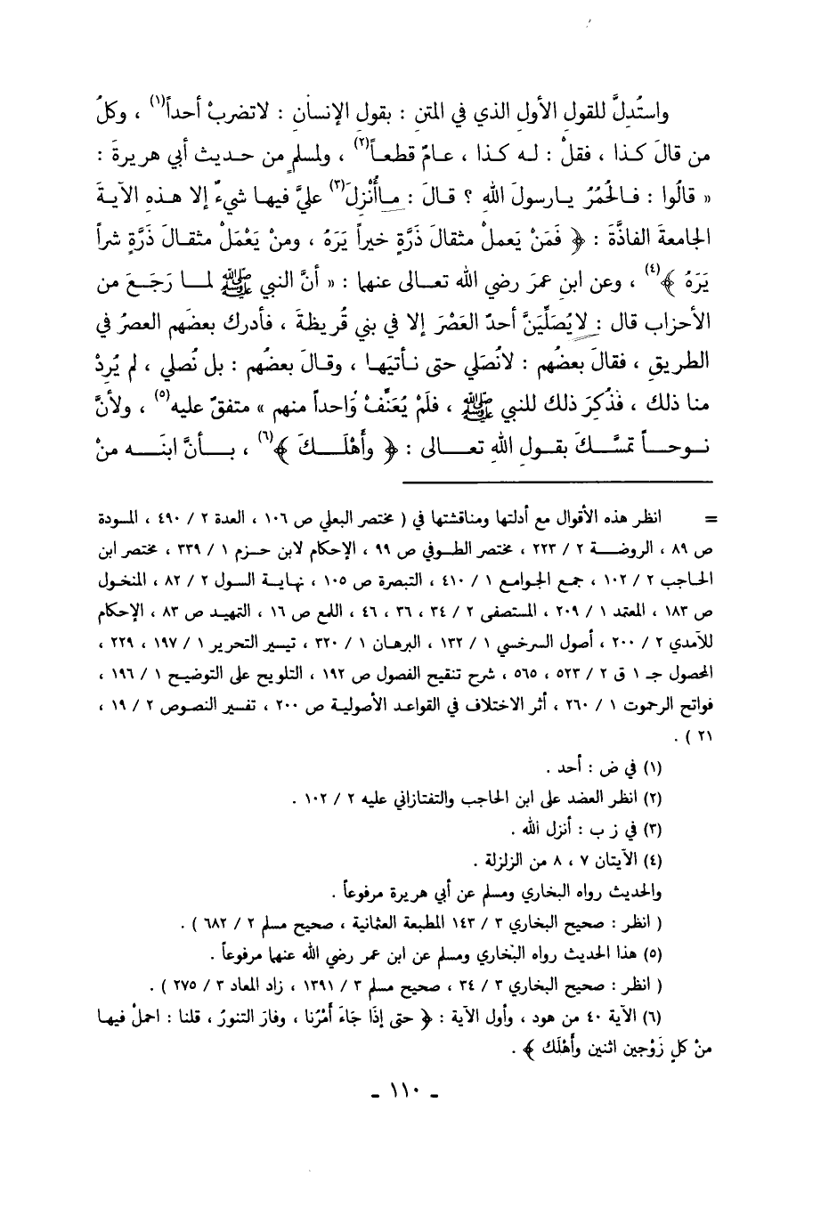 وَاسْتُدِلَّ لِلْقَوْلِ الأَوَّلِ الَّذِي فِي الْمَتْنِ بِقَوْلِ الإِنْسَانِ: لا تَضْرِبْ أَحَدًا1. وَكُلُّ مَنْ قَالَ كَذَا فَقُلْ لَهُ كَذَا عَامٌّ قَطْعًا2. وَلِمُسْلِمٍ مِنْ حَدِيثِ أَبِي هُرَيْرَةَ قَالُوا: فَالْحُمُرُ يَا رَسُولَ اللَّهِ؟ قَالَ: "مَا أُنْزِلَ3 عَلَيَّ فِيهَا شَيْءٌ إلاَّ هَذِهِ الآيَةُ الْجَامِعَةُ الْفَاذَّةُ" {فَمَنْ يَعْمَلْ مِثْقَالَ ذَرَّةٍ خَيْرًا يَرَهُ وَمَنْ يَعْمَلْ مِثْقَالَ ذَرَّةٍ شَرًّا يَرَهُ} 4 وَعَنْ ابْنِ عُمَرَ رَضِيَ اللَّهُ عَنْهُمَا أَنَّ النَّبِيَّ صَلَّى اللَّهُ عَلَيْهِ وَسَلَّمَ لَمَّا رَجَعَ مِنْ الأَحْزَابِ قَالَ: "لا يُصَلِّيَنَّ أَحَدٌ الْعَصْرَ إلاَّ فِي بَنِي قُرَيْظَةَ". فَأَدْرَكَ بَعْضَهُمْ الْعَصْرُ فِي الطَّرِيقِ. فَقَالَ بَعْضُهُمْ: لا نُصَلِّي حَتَّى نَأْتِيَهَا، وَقَالَ بَعْضُهُمْ: بَلْ نُصَلِّي، لَمْ يُرِدْ مِنَّا ذَلِكَ. فَذُكِرَ ذَلِكَ لِلنَّبِيِّ صَلَّى اللَّهُ عَلَيْهِ وَسَلَّمَ. فَلَمْ يُعَنِّفْ وَاحِدًا مِنْهُمْ مُتَّفَقٌ عَلَيْهِ5، وَلأَنَّ نُوحًا تَمَسَّك بِقَوْلِ اللَّهِ تَعَالَى {وَأَهْلَكَ} 6 بِأَنَّ ابْنَهُ مِنْ
