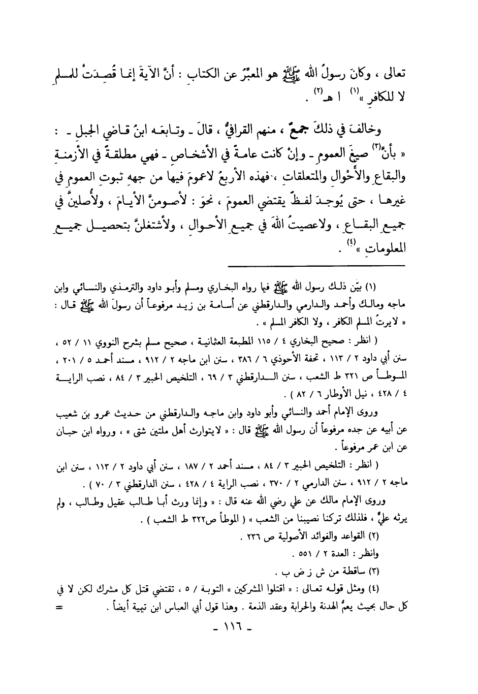 4 ومثل قوله تعالى: {فَاقْتُلُواْ الْمُشْرِكِينَ} التوبة/5، تقتضي قتل كل مشرك لكن في كل حال بحيث يعم الهدنة والحرابة وعقد الذمة. وهذا قول أبي العباس ابن تيمية أيضا. ً