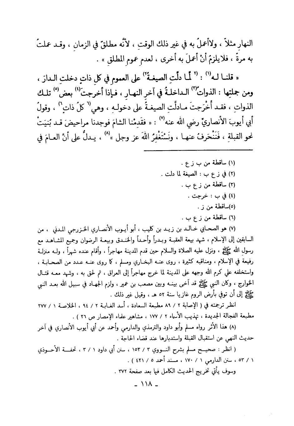 قُلْنَا لَهُ1: لَمَّا دَلَّتْ الصِّيغَةُ2 عَلَى الْعُمُومِ فِي كُلِّ ذَاتٍ دَخَلَتْ الدَّارَ، وَمِنْ جُمْلَتِهَا الذَّوَاتُ3 الدَّاخِلَةُ فِي آخِرِ النَّهَارِ. فَإِذَا أَخْرَجْت4 بَعْضَ5 تِلْكَ الذَّوَاتِ، فَقَدْ أَخْرَجْت مَا دَلَّتْ الصِّيغَةُ عَلَى دُخُولِهِ وَهِيَ كُلُّ ذَاتٍ6.وَقَوْلُ أَبِي أَيُّوبَ الأَنْصَارِيِّ. رَضِيَ اللَّهُ عَنْهُ7."فَقَدِمْنَا الشَّامَ فَوَجَدْنَا مَرَاحِيضَ قَدْ بُنِيَتْ نَحْوَ الْقِبْلَةِ، فَنَنْحَرِفُ عَنْهَا وَنَسْتَغْفِرُ اللَّهَ عَزَّ وَجَلَّ8" يَدُلُّ عَلَى أَنَّ الْعَامَّ فِي