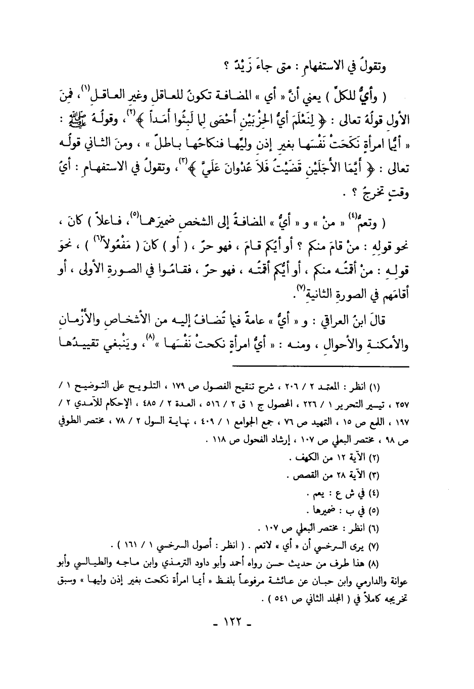 7 يرى السرخسي أن "أي" لا تعم. "انظر: أصول السرخسي 1/161".