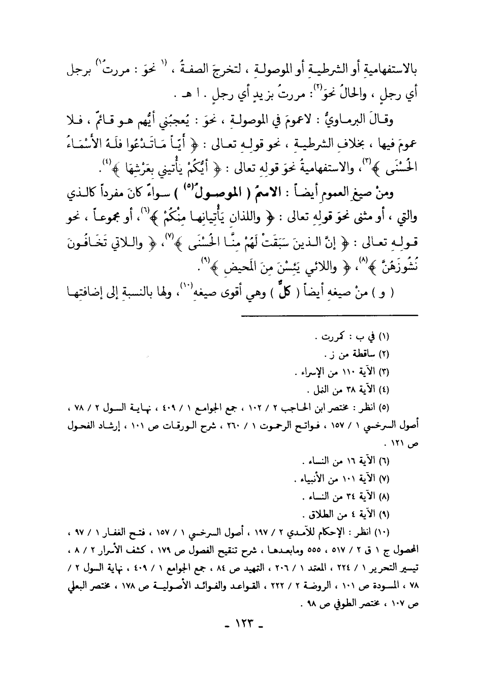 "وَ"مِنْ صِيَغِ الْعُمُومِ أَيْضًا: الاسْمُ "الْمَوْصُولُ 5 " سَوَاءٌ كَانَ مُفْرَدًا كَاَلَّذِي وَاَلَّتِي أَوْ مَثْنًى نَحْوَ قَوْله تَعَالَى: {وَاَللَّذَانِ يَأْتِيَانِهَا مِنْكُمْ} 6 أَوْ مَجْمُوعًا نَحْوَ قَوْله تَعَالَى: {إنَّ الَّذِينَ سَبَقَتْ لَهُمْ مِنَّا الْحُسْنَى} 7 {وَاَللاَّتِي تَخَافُونَ نُشُوزَهُنَّ} 8 {وَاَللاَّئِي يَئِسْنَ مِنْ الْمَحِيضِ} 9.